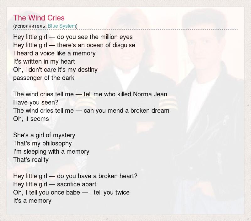 Hey little girl — do you see the million eyes Hey little girl — there's an ocean of disguise I heard a voice like a memory It's written in my heart Oh, i don't care it's my destiny passenger of the dark The wind cries tell me — tell me who killed Norma Jean Have you seen? The wind cries tell me — can you mend a broken dream Oh, it seems She's a girl of mystery That's my philosophy I'm sleeping with a memory That's reality Hey little girl — do you have a broken heart? Hey little girl — sacrifice apart Oh, I tell you once babe — I tell you twice It's a memory