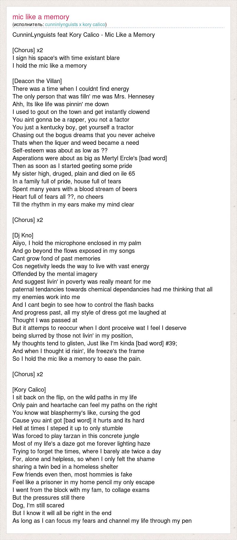 CunninLynguists feat Kory Calico - Mic Like a Memory [Chorus] x2 I sign his space's with time existant blare I hold the mic like a memory [Deacon the Villan] There was a time when I couldnt find energy The only person that was filln' me was Mrs. Hennesey Ahh, Its like life was pinnin' me down I used to gout on the town and get instantly clowend You aint gonna be a rapper, you not a factor You just a kentucky boy, get yourself a tractor Chasing out the bogus dreams that you never acheive Thats when the liquer and weed became a need Self-esteem was about as low as ?? Asperations were about as big as Mertyl Ercle's [bad word] Then as soon as I started geeting some pride My sister high, druged, plain and died on ile 65 In a family full of pride, house full of tears Spent many years with a blood stream of beers Heart full of fears all ??, no cheers Till the rhythm in my ears make my mind clear [Chorus] x2 [Dj Kno] Aiiyo, I hold the microphone enclosed in my palm And go beyond the flows exposed in my songs Cant grow fond of past memories Cos negetivity leeds the way to live with vast energy Offended by the mental imagery And suggest livin' in poverty was really meant for me paternal tendancies towards chemical dependancies had me thinking that all my enemies work into me And I cant begin to see how to control the flash backs And progress past, all my style of dress got me laughed at Thought I was passed at But it attemps to reoccur when I dont proceive wat I feel I deserve being slurred by those not livin' in my position, My thoughts tend to glisten, Just like I'm kinda [bad word] #39; And when I thought id risin', life freeze's the frame So I hold the mic like a memory to ease the pain. [Chorus] x2 [Kory Calico] I sit back on the flip, on the wild paths in my life Only pain and heartache can feel my paths on the right You know wat blasphermy's like, cursing the god Cause you aint got [bad word] it hurts and its hard Hell at times I steped it up to only stumble Was forced to play tarzan in this concrete jungle Most of my life's a daze got me forever lighting haze Trying to forget the times, where I barely ate twice a day For, alone and helpless, so when I only felt the shame sharing a twin bed in a homeless shelter Few friends even then, most hommies is fake Feel like a prisoner in my home pencil my only escape I went from the block with my fam, to collage exams But the pressures still there Dog, I'm still scared But I know it will all be right in the end As long as I can focus my fears and channel my life through my pen