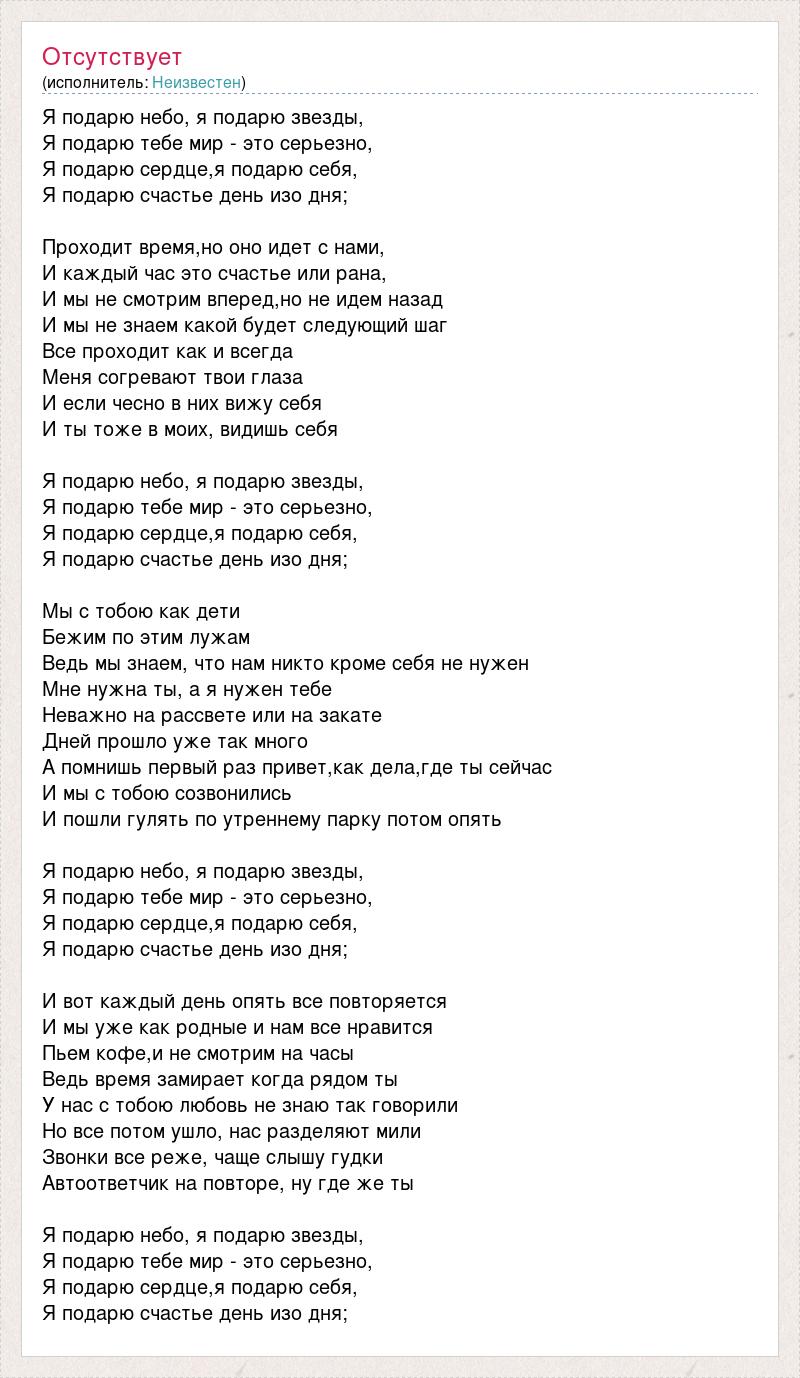 Я подарю небо, я подарю звезды, Я подарю тебе мир - это серьезно, Я подарю сердце,я подарю себя, Я подарю счастье день изо дня; Проходит время,но оно идет с нами, И каждый час это счастье или рана, И мы не смотрим вперед,но не идем назад И мы не знаем какой будет следующий шаг Все проходит как и всегда Меня согревают твои глаза И если чесно в них вижу себя И ты тоже в моих, видишь себя Я подарю небо, я подарю звезды, Я подарю тебе мир - это серьезно, Я подарю сердце,я подарю себя, Я подарю счастье день изо дня; Мы с тобою как дети Бежим по этим лужам Ведь мы знаем, что нам никто кроме себя не нужен Мне нужна ты, а я нужен тебе Неважно на рассвете или на закате Дней прошло уже так много А помнишь первый раз привет,как дела,где ты сейчас И мы с тобою созвонились И пошли гулять по утреннему парку потом опять Я подарю небо, я подарю звезды, Я подарю тебе мир - это серьезно, Я подарю сердце,я подарю себя, Я подарю счастье день изо дня; И вот каждый день опять все повторяется И мы уже как родные и нам все нравится Пьем кофе,и не смотрим на часы Ведь время замирает когда рядом ты У нас с тобою любовь не знаю так говорили Но все потом ушло, нас разделяют мили Звонки все реже, чаще слышу гудки Автоответчик на повторе, ну где же ты Я подарю небо, я подарю звезды, Я подарю тебе мир - это серьезно, Я подарю сердце,я подарю себя, Я подарю счастье день изо дня;