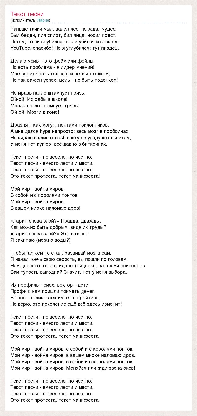 Раньше тачки мыл, валил лес, не ждал чудес. Был беден, пил спирт, бил лица, носил крест. Потом, то ли врубился, то ли убился и воскрес. YouTube, спасибо! Но я углубился: тут пиздец. Делаю мемы - это фейм или фейлы, Но есть проблема - я лидер мнений! Мне верит часть тех, кто и не жил толком; Не так важен успех: цель - не быть подонком! Но мразь нагло штампует грязь. Ой-ой! Их рабы в школе! Мразь нагло штампует грязь. Ой-ой! Мозги в коме! Дразнят, как могут, понтами поклонников, А мне дался hype непросто: весь мозг в пробоинах. Не кидаю в клипах cash в шкур в угоду школьникам, У меня нет купюр: всё давно в биткоинах. Текст песни - не весело, но честно; Текст песни - вместо лести и мести. Текст песни - не весело, но честно; Это текст протеста, текст манифеста! Мой мир - война миров, С собой и с королями понтов. Мой мир - война миров, В вашем мирке наломаю дров! «Ларин снова злой?» Правда, дважды. Как можно быть добрым, видя их труды? «Ларин снова злой?» Это важно - Я закипаю (можно воды?) Чтобы fan кем-то стал, развивай мозги сам. Я начал жечь свою серость, вы пошли по головам. Нам держать ответ, идолы (пидоры), за племя спиннеров. Вам тупость выгодна? Значит, нет у меня выбора. Их профиль - смех, вектор - дети. Профи к нам пришли поиметь денег. В топе - телик, всех имеет на рейтинг; Но верю, это поколение ещё всё здесь изменит! Текст песни - не весело, но честно; Текст песни - вместо лести и мести. Текст песни - не весело, но честно; Это текст протеста, текст манифеста. Мой мир - война миров, с собой и с королями понтов. Мой мир - война миров, в вашем мирке наломаю дров. Мой мир - война миров, с собой и с королями понтов. Мой мир - война миров. Меняйся или жди звона оков! Текст песни - не весело, но честно; Текст песни - вместо лести и мести. Текст песни - не весело, но честно; Это текст протеста, текст манифеста.