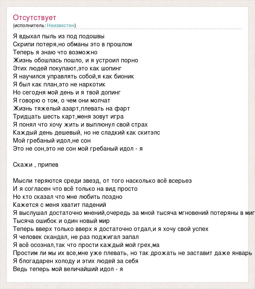 Я вдыхал пыль из под подошвы Скрипи потеря,но обманы это в прошлом Теперь я знаю что возможно Жизнь обошлась пошло, и я устроил порно Этих людей покупают,это как шопинг Я научился управлять собой,я как бионик Я был как план,это не наркотик Но сегодня мой день и я твой допинг Я говорю о том, о чем они молчат Жизнь тяжелый азарт,плевать на фарт Тридцать шесть карт,меня зовут игра Я понял что хочу жить и выплюнул свой страх Каждый день дешевый, но не сладкий как скитэлс Мой гребаный идол,не сон Это не сон,это не сон мой гребаный идол - я Скажи , припев Мысли теряются среди звезд, от того насколько всё всерьез И я согласен что всё только на вид просто Но кто сказал что мне любить поздно Кажется с меня хватит падений Я выслушал достаточно мнений,очередь за мной тысяча мгновений потеряны в миг Тысяча ошибок и один новый мир Теперь вверх только вверх я достаточно отдал,и я хочу свой успех Я человек скандал, не раз поджигал запал Я всё осознал,так что прости каждый мой грех,ма Простим ли мы их все,мне уже плевать, но так дрожать не заставит даже январь Я блогадарен холоду и этих людей за себя Ведь теперь мой величайший идол - я