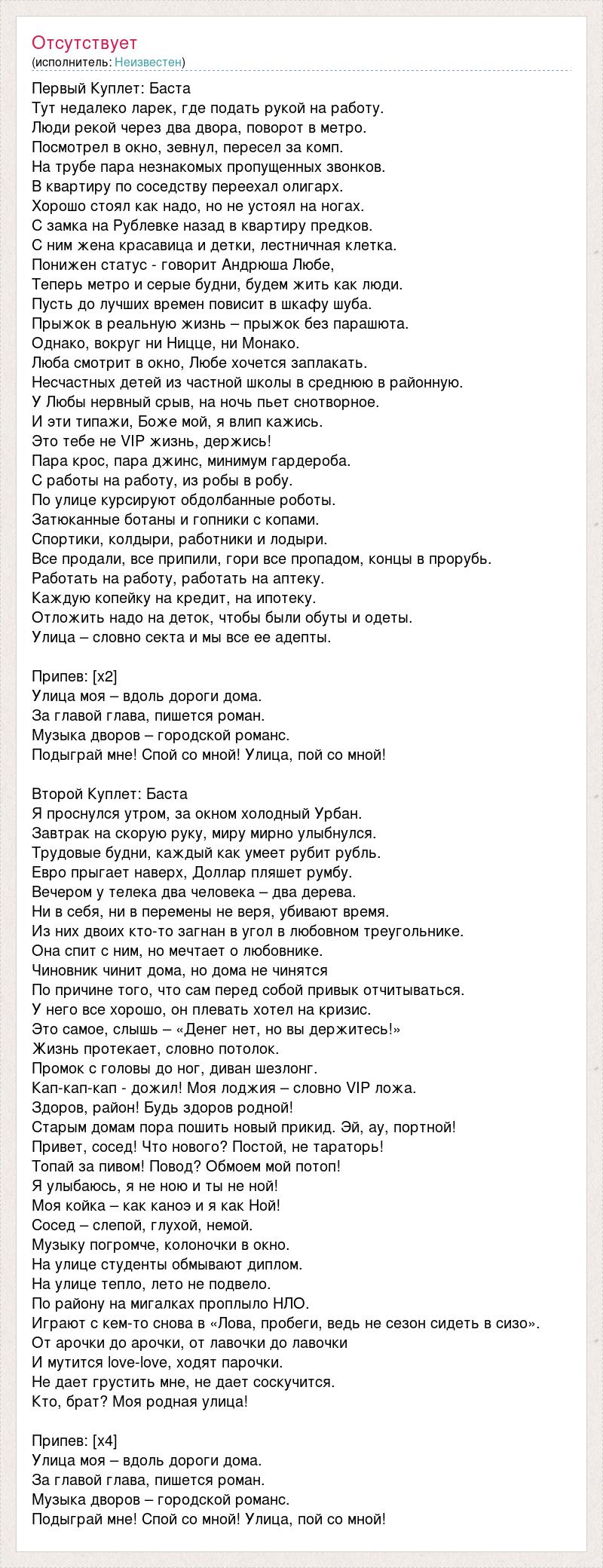 Первый Куплет: Баста Тут недалеко ларек, где подать рукой на работу. Люди рекой через два двора, поворот в метро. Посмотрел в окно, зевнул, пересел за комп. На трубе пара незнакомых пропущенных звонков. В квартиру по соседству переехал олигарх. Хорошо стоял как надо, но не устоял на ногах. С замка на Рублевке назад в квартиру предков. С ним жена красавица и детки, лестничная клетка. Понижен статус - говорит Андрюша Любе, Теперь метро и серые будни, будем жить как люди. Пусть до лучших времен повисит в шкафу шуба. Прыжок в реальную жизнь – прыжок без парашюта. Однако, вокруг ни Ницце, ни Монако. Люба смотрит в окно, Любе хочется заплакать. Несчастных детей из частной школы в среднюю в районную. У Любы нервный срыв, на ночь пьет снотворное. И эти типажи, Боже мой, я влип кажись. Это тебе не VIP жизнь, держись! Пара крос, пара джинс, минимум гардероба. С работы на работу, из робы в робу. По улице курсируют обдолбанные роботы. Затюканные ботаны и гопники с копами. Спортики, колдыри, работники и лодыри. Все продали, все припили, гори все пропадом, концы в прорубь. Работать на работу, работать на аптеку. Каждую копейку на кредит, на ипотеку. Отложить надо на деток, чтобы были обуты и одеты. Улица – словно секта и мы все ее адепты. Припев: [x2] Улица моя – вдоль дороги дома. За главой глава, пишется роман. Музыка дворов – городской романс. Подыграй мне! Спой со мной! Улица, пой со мной! Второй Куплет: Баста Я проснулся утром, за окном холодный Урбан. Завтрак на скорую руку, миру мирно улыбнулся. Трудовые будни, каждый как умеет рубит рубль. Евро прыгает наверх, Доллар пляшет румбу. Вечером у телека два человека – два дерева. Ни в себя, ни в перемены не веря, убивают время. Из них двоих кто-то загнан в угол в любовном треугольнике. Она спит с ним, но мечтает о любовнике. Чиновник чинит дома, но дома не чинятся По причине того, что сам перед собой привык отчитываться. У него все хорошо, он плевать хотел на кризис. Это самое, слышь – «Денег нет, но вы держитесь!» Жизнь протекает, словно потолок. Промок с головы до ног, диван шезлонг. Кап-кап-кап - дожил! Моя лоджия – словно VIP ложа. Здоров, район! Будь здоров родной! Старым домам пора пошить новый прикид. Эй, ау, портной! Привет, сосед! Что нового? Постой, не тараторь! Топай за пивом! Повод? Обмоем мой потоп! Я улыбаюсь, я не ною и ты не ной! Моя койка – как каноэ и я как Ной! Сосед – слепой, глухой, немой. Музыку погромче, колоночки в окно. На улице студенты обмывают диплом. На улице тепло, лето не подвело. По району на мигалках проплыло НЛО. Играют с кем-то снова в «Лова, пробеги, ведь не сезон сидеть в сизо». От арочки до арочки, от лавочки до лавочки И мутится love-love, ходят парочки. Не дает грустить мне, не дает соскучится. Кто, брат? Моя родная улица! Припев: [x4] Улица моя – вдоль дороги дома. За главой глава, пишется роман. Музыка дворов – городской романс. Подыграй мне! Спой со мной! Улица, пой со мной!