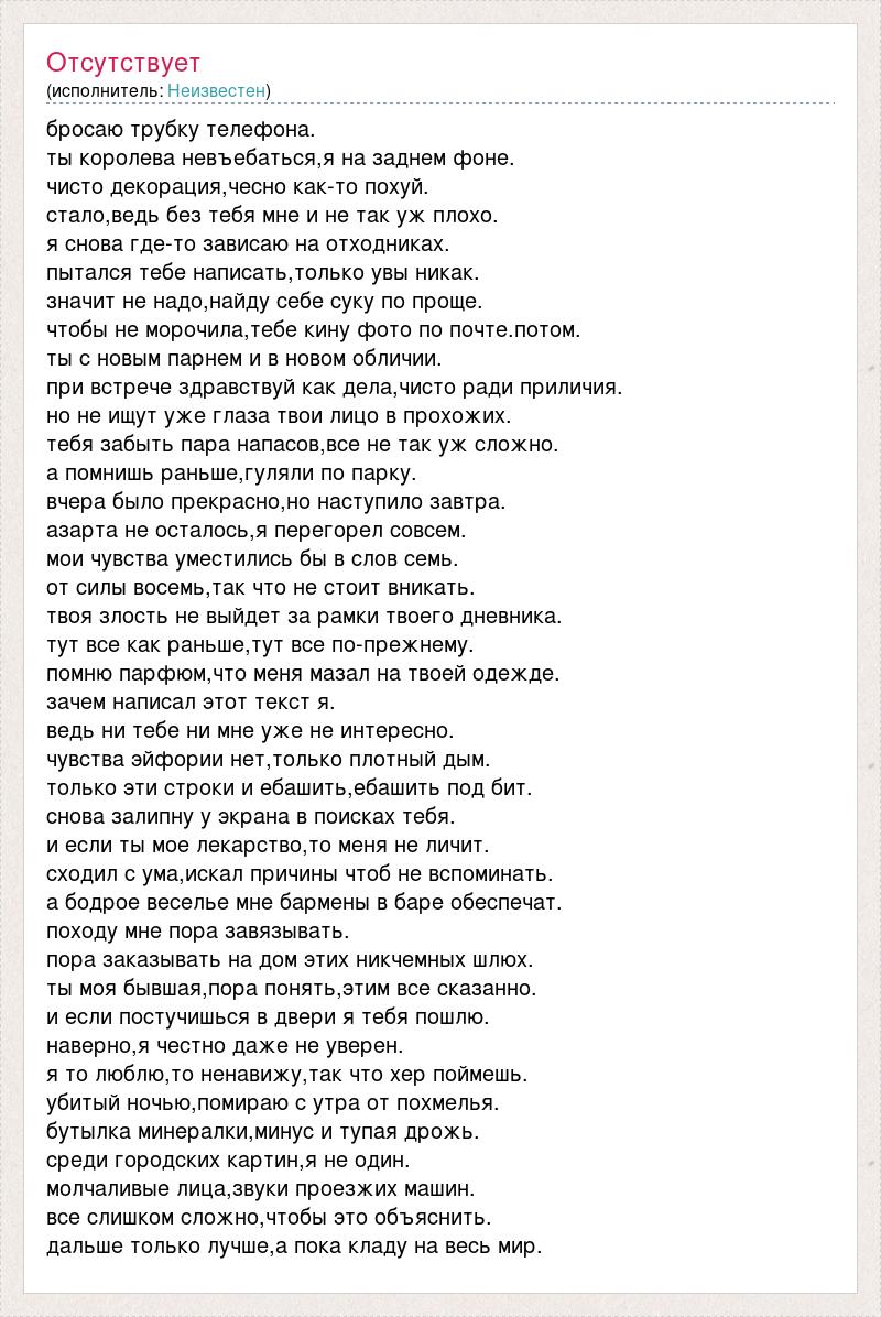 бросаю трубку телефона. ты королева невъебаться,я на заднем фоне. чисто декорация,чесно как-то похуй. стало,ведь без тебя мне и не так уж плохо. я снова где-то зависаю на отходниках. пытался тебе написать,только увы никак. значит не надо,найду себе суку по проще. чтобы не морочила,тебе кину фото по почте.потом. ты с новым парнем и в новом обличии. при встрече здравствуй как дела,чисто ради приличия. но не ищут уже глаза твои лицо в прохожих. тебя забыть пара напасов,все не так уж сложно. а помнишь раньше,гуляли по парку. вчера было прекрасно,но наступило завтра. азарта не осталось,я перегорел совсем. мои чувства уместились бы в слов семь. от силы восемь,так что не стоит вникать. твоя злость не выйдет за рамки твоего дневника. тут все как раньше,тут все по-прежнему. помню парфюм,что меня мазал на твоей одежде. зачем написал этот текст я. ведь ни тебе ни мне уже не интересно. чувства эйфории нет,только плотный дым. только эти строки и ебашить,ебашить под бит. снова залипну у экрана в поисках тебя. и если ты мое лекарство,то меня не личит. сходил с ума,искал причины чтоб не вспоминать. а бодрое веселье мне бармены в баре обеспечат. походу мне пора завязывать. пора заказывать на дом этих никчемных шлюх. ты моя бывшая,пора понять,этим все сказанно. и если постучишься в двери я тебя пошлю. наверно,я честно даже не уверен. я то люблю,то ненавижу,так что хер поймешь. убитый ночью,помираю с утра от похмелья. бутылка минералки,минус и тупая дрожь. среди городских картин,я не один. молчаливые лица,звуки проезжих машин. все слишком сложно,чтобы это объяснить. дальше только лучше,а пока кладу на весь мир.