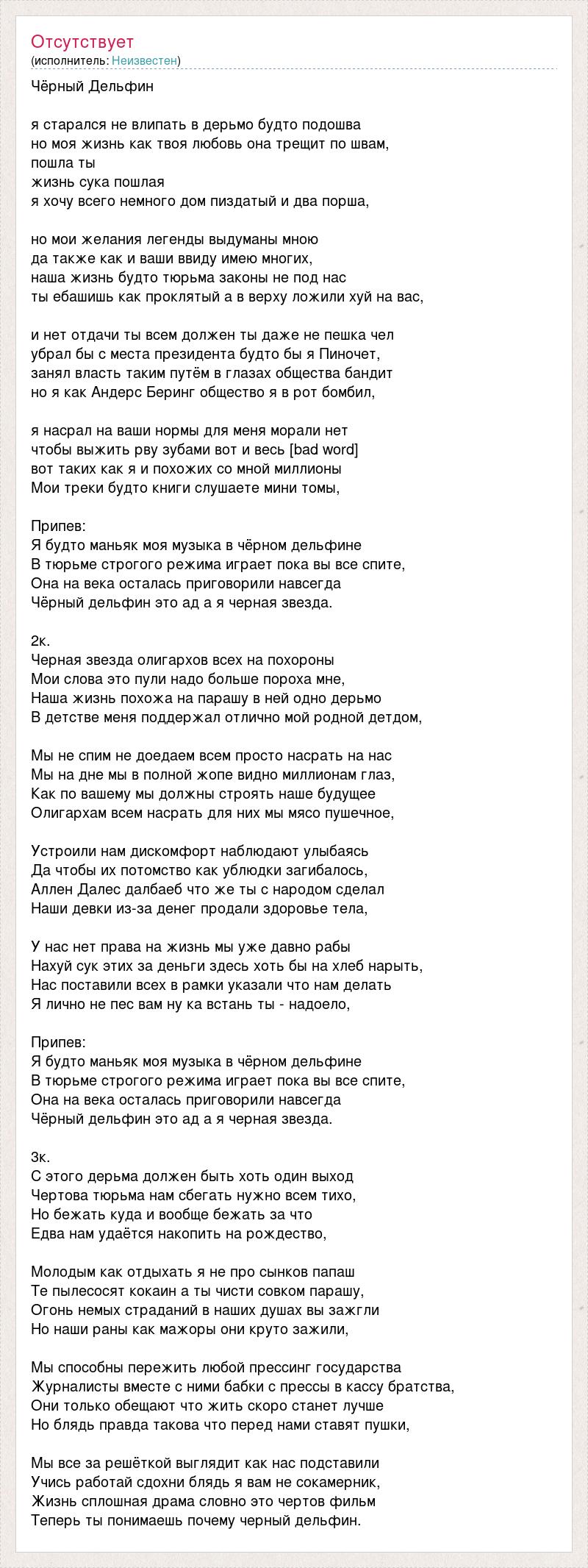 Чёрный Дельфин я старался не влипать в дерьмо будто подошва но моя жизнь как твоя любовь она трещит по швам, пошла ты жизнь сука пошлая я хочу всего немного дом пиздатый и два порша, но мои желания легенды выдуманы мною да также как и ваши ввиду имею многих, наша жизнь будто тюрьма законы не под нас ты ебашишь как проклятый а в верху ложили хуй на вас, и нет отдачи ты всем должен ты даже не пешка чел убрал бы с места президента будто бы я Пиночет, занял власть таким путём в глазах общества бандит но я как Андерс Беринг общество я в рот бомбил, я насрал на ваши нормы для меня морали нет чтобы выжить рву зубами вот и весь [bad word] вот таких как я и похожих со мной миллионы Мои треки будто книги слушаете мини томы, Припев: Я будто маньяк моя музыка в чёрном дельфине В тюрьме строгого режима играет пока вы все спите, Она на века осталась приговорили навсегда Чёрный дельфин это ад а я черная звезда. 2к. Черная звезда олигархов всех на похороны Мои слова это пули надо больше пороха мне, Наша жизнь похожа на парашу в ней одно дерьмо В детстве меня поддержал отлично мой родной детдом, Мы не спим не доедаем всем просто насрать на нас Мы на дне мы в полной жопе видно миллионам глаз, Как по вашему мы должны строять наше будущее Олигархам всем насрать для них мы мясо пушечное, Устроили нам дискомфорт наблюдают улыбаясь Да чтобы их потомство как ублюдки загибалось, Аллен Далес далбаеб что же ты с народом сделал Наши девки из-за денег продали здоровье тела, У нас нет права на жизнь мы уже давно рабы Нахуй сук этих за деньги здесь хоть бы на хлеб нарыть, Нас поставили всех в рамки указали что нам делать Я лично не пес вам ну ка встань ты - надоело, Припев: Я будто маньяк моя музыка в чёрном дельфине В тюрьме строгого режима играет пока вы все спите, Она на века осталась приговорили навсегда Чёрный дельфин это ад а я черная звезда. 3к. С этого дерьма должен быть хоть один выход Чертова тюрьма нам сбегать нужно всем тихо, Но бежать куда и вообще бежать за что Едва нам удаётся накопить на рождество, Молодым как отдыхать я не про сынков папаш Те пылесосят кокаин а ты чисти совком парашу, Огонь немых страданий в наших душах вы зажгли Но наши раны как мажоры они круто зажили, Мы способны пережить любой прессинг государства Журналисты вместе с ними бабки с прессы в кассу братства, Они только обещают что жить скоро станет лучше Но блядь правда такова что перед нами ставят пушки, Мы все за решёткой выглядит как нас подставили Учись работай сдохни блядь я вам не сокамерник, Жизнь сплошная драма словно это чертов фильм Теперь ты понимаешь почему черный дельфин.