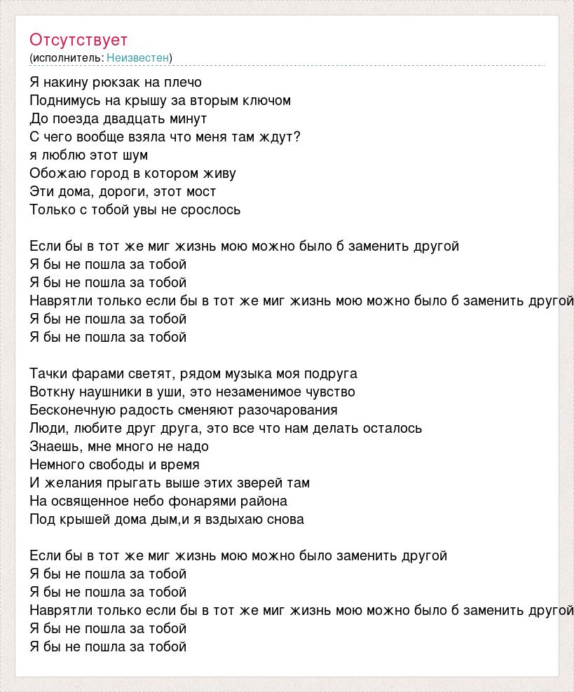 Я накину рюкзак на плечо Поднимусь на крышу за вторым ключом До поезда двадцать минут С чего вообще взяла что меня там ждут? я люблю этот шум Обожаю город в котором живу Эти дома, дороги, этот мост Только с тобой увы не срослось Если бы в тот же миг жизнь мою можно было б заменить другой Я бы не пошла за тобой Я бы не пошла за тобой Наврятли только если бы в тот же миг жизнь мою можно было б заменить другой Я бы не пошла за тобой Я бы не пошла за тобой Тачки фарами светят, рядом музыка моя подруга Воткну наушники в уши, это незаменимое чувство Бесконечную радость сменяют разочарования Люди, любите друг друга, это все что нам делать осталось Знаешь, мне много не надо Немного свободы и время И желания прыгать выше этих зверей там На освященное небо фонарями района Под крышей дома дым,и я вздыхаю снова Если бы в тот же миг жизнь мою можно было заменить другой Я бы не пошла за тобой Я бы не пошла за тобой Наврятли только если бы в тот же миг жизнь мою можно было б заменить другой Я бы не пошла за тобой Я бы не пошла за тобой
