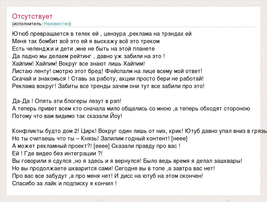 Ютюб превращается в телек ей , цензура ,реклама на трэндах ей Меня так бомбит всё это ей я выскажу всё это треком Есть челенджи и дети ,мне не быть на этой планете Да ладно мы делаем рейтинг , давно уж забили на это ! Хайпим! Хайпим! Вокруг все знают лишь Хайпим! Листаю ленту! смотрю этот бред! Фейспалм на лице всему мой ответ! Скачай и знакомься ! Ставь за работу, акции просто бери не работай! Реклама вокруг! Забиты все тренды зачем они тут все забили про это! Да-Да ! Опять эти блогеры лезут в рэп! А теперь привет всем кто сначала мило общались со мною ,а теперь обходят стороною Потому что вам видимо так сказали Йоу! Конфликты будто дом 2! Цирк! Вокруг один лишь от них, крик! Ютуб давно упал вниз в грязь Но ты считаешь что ты – Князь! Запилим годный контент! [неее] А может рекламный проект?! [ееее] Сказали правду про вас ! Ей ! Где видео без интеграции ?! Вы говорили я сдулся ,но я здесь и я вернулся! Было ведь время я делал зашквары! Но вы продолжаете шкварится сами! Сегодня вы в топе ,а завтра вас нет! Про вас все забудут ,а про меня нет! И дисс на ютуб на этом окончен! Спасибо за лайк и подписку я кончил !