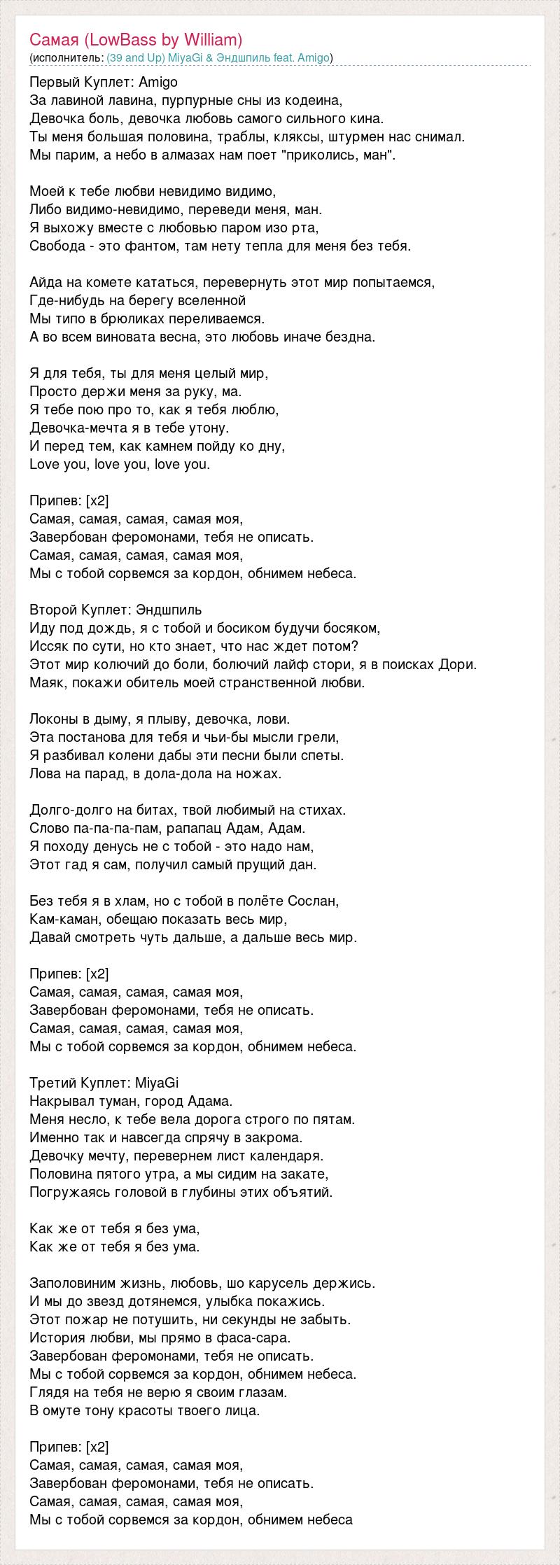 Первый Куплет: Amigo За лавиной лавина, пурпурные сны из кодеина, Девочка боль, девочка любовь самого сильного кина. Ты меня большая половина, траблы, кляксы, штурмен нас снимал. Мы парим, а небо в алмазах нам поет "приколись, ман". Моей к тебе любви невидимо видимо, Либо видимо-невидимо, переведи меня, ман. Я выхожу вместе с любовью паром изо рта, Свобода - это фантом, там нету тепла для меня без тебя. Айда на комете кататься, перевернуть этот мир попытаемся, Где-нибудь на берегу вселенной Мы типо в брюликах переливаемся. А во всем виновата весна, это любовь иначе бездна. Я для тебя, ты для меня целый мир, Просто держи меня за руку, ма. Я тебе пою про то, как я тебя люблю, Девочка-мечта я в тебе утону. И перед тем, как камнем пойду ко дну, Love you, love you, love you. Припев: [х2] Самая, самая, самая, самая моя, Завербован феромонами, тебя не описать. Самая, самая, самая, самая моя, Мы с тобой сорвемся за кордон, обнимем небеса. Второй Куплет: Эндшпиль Иду под дождь, я с тобой и босиком будучи босяком, Иссяк по сути, но кто знает, что нас ждет потом? Этот мир колючий до боли, болючий лайф стори, я в поисках Дори. Маяк, покажи обитель моей странственной любви. Локоны в дыму, я плыву, девочка, лови. Эта постанова для тебя и чьи-бы мысли грели, Я разбивал колени дабы эти песни были спеты. Лова на парад, в дола-дола на ножах. Долго-долго на битах, твой любимый на стихах. Слово па-па-па-пам, рапапац Адам, Адам. Я походу денусь не с тобой - это надо нам, Этот гад я сам, получил самый прущий дан. Без тебя я в хлам, но с тобой в полёте Сослан, Кам-каман, обещаю показать весь мир, Давай смотреть чуть дальше, а дальше весь мир. Припев: [х2] Самая, самая, самая, самая моя, Завербован феромонами, тебя не описать. Самая, самая, самая, самая моя, Мы с тобой сорвемся за кордон, обнимем небеса. Третий Куплет: MiyaGi Накрывал туман, город Адама. Меня несло, к тебе вела дорога строго по пятам. Именно так и навсегда спрячу в закрома. Девочку мечту, перевернем лист календаря. Половина пятого утра, а мы сидим на закате, Погружаясь головой в глубины этих объятий. Как же от тебя я без ума, Как же от тебя я без ума. Заполовиним жизнь, любовь, шо карусель держись. И мы до звезд дотянемся, улыбка покажись. Этот пожар не потушить, ни секунды не забыть. История любви, мы прямо в фаса-сара. Завербован феромонами, тебя не описать. Мы с тобой сорвемся за кордон, обнимем небеса. Глядя на тебя не верю я своим глазам. В омуте тону красоты твоего лица. Припев: [х2] Самая, самая, самая, самая моя, Завербован феромонами, тебя не описать. Самая, самая, самая, самая моя, Мы с тобой сорвемся за кордон, обнимем небеса