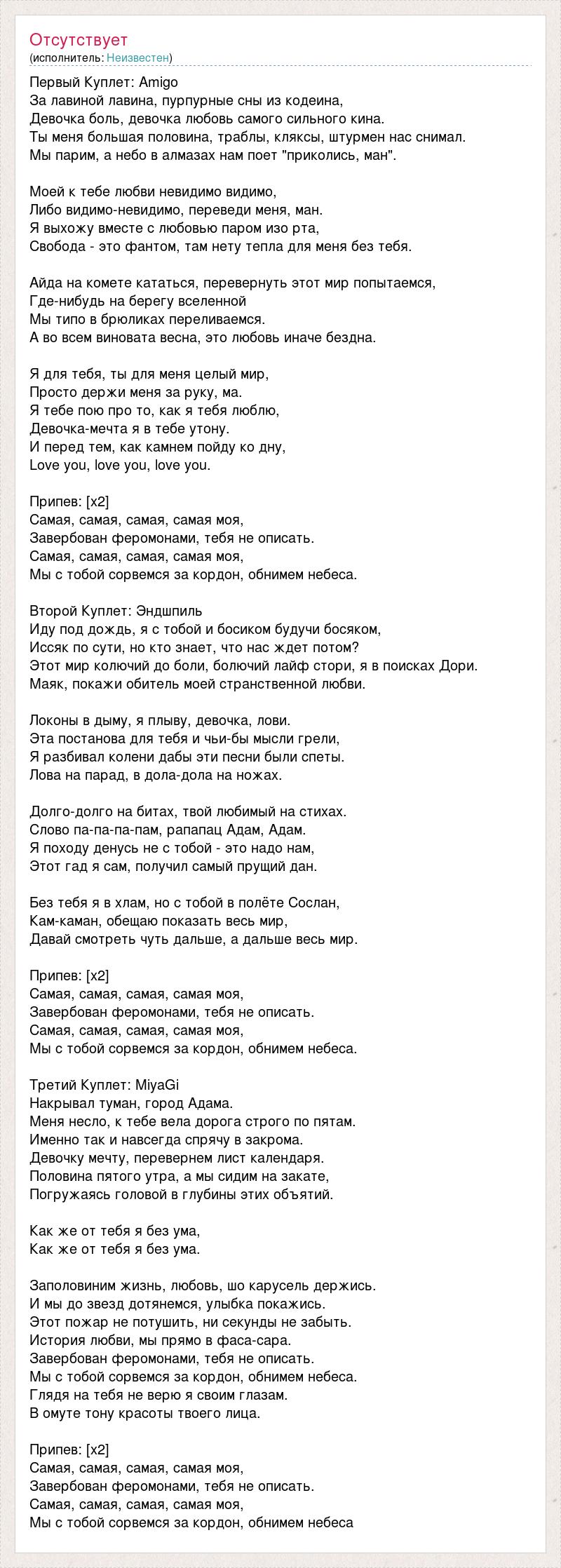 Первый Куплет: Amigo За лавиной лавина, пурпурные сны из кодеина, Девочка боль, девочка любовь самого сильного кина. Ты меня большая половина, траблы, кляксы, штурмен нас снимал. Мы парим, а небо в алмазах нам поет "приколись, ман". Моей к тебе любви невидимо видимо, Либо видимо-невидимо, переведи меня, ман. Я выхожу вместе с любовью паром изо рта, Свобода - это фантом, там нету тепла для меня без тебя. Айда на комете кататься, перевернуть этот мир попытаемся, Где-нибудь на берегу вселенной Мы типо в брюликах переливаемся. А во всем виновата весна, это любовь иначе бездна. Я для тебя, ты для меня целый мир, Просто держи меня за руку, ма. Я тебе пою про то, как я тебя люблю, Девочка-мечта я в тебе утону. И перед тем, как камнем пойду ко дну, Love you, love you, love you. Припев: [х2] Самая, самая, самая, самая моя, Завербован феромонами, тебя не описать. Самая, самая, самая, самая моя, Мы с тобой сорвемся за кордон, обнимем небеса. Второй Куплет: Эндшпиль Иду под дождь, я с тобой и босиком будучи босяком, Иссяк по сути, но кто знает, что нас ждет потом? Этот мир колючий до боли, болючий лайф стори, я в поисках Дори. Маяк, покажи обитель моей странственной любви. Локоны в дыму, я плыву, девочка, лови. Эта постанова для тебя и чьи-бы мысли грели, Я разбивал колени дабы эти песни были спеты. Лова на парад, в дола-дола на ножах. Долго-долго на битах, твой любимый на стихах. Слово па-па-па-пам, рапапац Адам, Адам. Я походу денусь не с тобой - это надо нам, Этот гад я сам, получил самый прущий дан. Без тебя я в хлам, но с тобой в полёте Сослан, Кам-каман, обещаю показать весь мир, Давай смотреть чуть дальше, а дальше весь мир. Припев: [х2] Самая, самая, самая, самая моя, Завербован феромонами, тебя не описать. Самая, самая, самая, самая моя, Мы с тобой сорвемся за кордон, обнимем небеса. Третий Куплет: MiyaGi Накрывал туман, город Адама. Меня несло, к тебе вела дорога строго по пятам. Именно так и навсегда спрячу в закрома. Девочку мечту, перевернем лист календаря. Половина пятого утра, а мы сидим на закате, Погружаясь головой в глубины этих объятий. Как же от тебя я без ума, Как же от тебя я без ума. Заполовиним жизнь, любовь, шо карусель держись. И мы до звезд дотянемся, улыбка покажись. Этот пожар не потушить, ни секунды не забыть. История любви, мы прямо в фаса-сара. Завербован феромонами, тебя не описать. Мы с тобой сорвемся за кордон, обнимем небеса. Глядя на тебя не верю я своим глазам. В омуте тону красоты твоего лица. Припев: [х2] Самая, самая, самая, самая моя, Завербован феромонами, тебя не описать. Самая, самая, самая, самая моя, Мы с тобой сорвемся за кордон, обнимем небеса