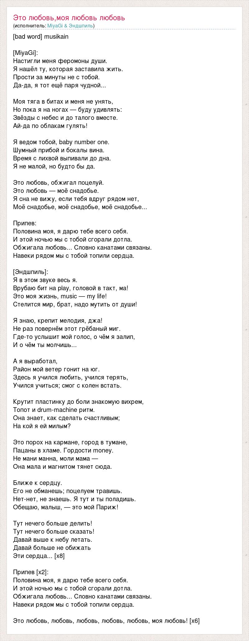 [bad word] musikain [MiyaGi]: Настигли меня феромоны души. Я нашёл ту, которая заставила жить. Прости за минуты не с тобой. Да-да, я тот ещё паря чудной... Моя тяга в битах и меня не унять, Но пока я на ногах — буду удивлять: Звёзды с небес и до талого вместе. Ай-да по облакам гулять! Я ведом тобой, baby number one. Шумный прибой и бокалы вина. Время с лихвой выпивали до дна. Я не малой, но будто бы да. Это любовь, обжигал поцелуй. Это любовь — моё снадобье. Я сна не вижу, если тебя вдруг рядом нет, Моё снадобье, моё снадобье, моё снадобье... Припев: Половина моя, я дарю тебе всего себя. И этой ночью мы с тобой сгорали дотла. Обжигала любовь... Словно канатами связаны. Навеки рядом мы с тобой топили сердца. [Эндшпиль]: Я в этом звуке весь я. Врубаю бит на play, головой в такт, ма! Это моя жизнь, music — my life! Стелится мир, брат, надо мутить от души! Я знаю, крепит мелодия, джа! Не раз повернём этот грёбаный миг. Где-то услышит мой голос, о чём я залип, И о чём ты молчишь... А я выработал, Район мой ветер гонит на юг. Здесь я учился любить, учился терять, Учился учиться; смог с колен встать. Крутит пластинку до боли знакомую вихрем, Топот и drum-machine ритм. Она знает, как сделать счастливым; На кой я ей милым? Это порох на кармане, город в тумане, Пацаны в хламе. Гордости money. Не мани манна, моли мама — Она мала и магнитом тянет сюда. Ближе к сердцу. Его не обманешь; поцелуем травишь. Нет-нет, не знаешь. Я тут и ты поладишь. Обещаю, малыш, — это мой Париж! Тут нечего больше делить! Тут нечего больше сказать! Давай выше к небу летать. Давай больше не обижать Эти сердца... [x8] Припев [x2]: Половина моя, я дарю тебе всего себя. И этой ночью мы с тобой сгорали дотла. Обжигала любовь... Словно канатами связаны. Навеки рядом мы с тобой топили сердца. Это любовь, любовь, любовь, любовь, любовь, моя любовь! [x6]