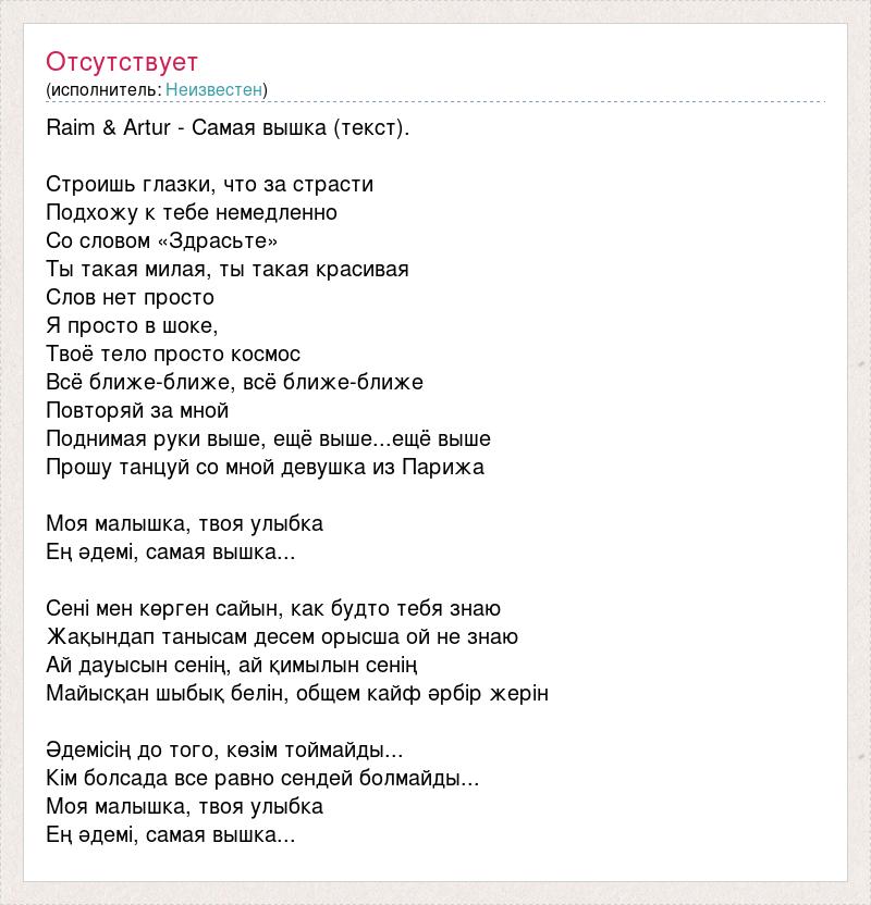 Raim & Artur - Самая вышка (текст). Строишь глазки, что за страсти Подхожу к тебе немедленно Со словом «Здрасьте» Ты такая милая, ты такая красивая Слов нет просто Я просто в шоке, Твоё тело просто космос Всё ближе-ближе, всё ближе-ближе Повторяй за мной Поднимая руки выше, ещё выше...ещё выше Прошу танцуй со мной девушка из Парижа Моя малышка, твоя улыбка Ең әдемі, самая вышка... Сені мен көрген сайын, как будто тебя знаю Жақындап танысам десем орысша ой не знаю Ай дауысын сенің, ай қимылын сенің Майысқан шыбық белін, общем кайф әрбір жерін Әдемісің до того, көзім тоймайды... Кім болсада все равно сендей болмайды... Моя малышка, твоя улыбка Ең әдемі, самая вышка...