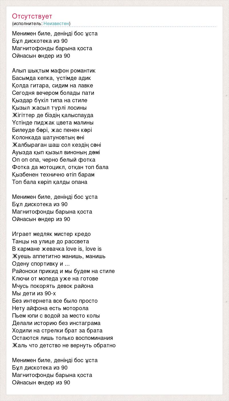 Менимен биле, деніңді бос ұста Бұл дискотека из 90 Магнитофонды барына қоста Ойнасын əндер из 90 Алып шықтым мафон романтик Басымда кепка, үстімде адик Қолда гитара, сидим на лавке Сегодня вечером болады пати Қыздар бүкіл типа на стиле Қызыл жасыл түрлі лосины Жігіттер де біздің қалыспауда Үстінде пиджак цвета малины Билеуде бəрі, жас пенен кəрі Колонкада шатуновтың əні Жалбыраған шаш сол кездің сəні Ауызда қып қызыл виноның дəмі Оп оп опа, черно белый фотка Фотка да мотоцикл, отқан топ бала Қызбенен технично өтіп барам Топ бала көріп қалды опана Менимен биле, деніңді бос ұста Бұл дискотека из 90 Магнитофонды барына қоста Ойнасын əндер из 90 Играет медляк мистер кредо Танцы на улице до рассвета В кармане жевачка love is, love is Жуешь аппетитно манишь, манишь Одену спортивку и ... Районски прикид и мы будем на стиле Ключи от мопеда уже на готове Мчусь покорять девок района Мы дети из 90-х Без интернета все было просто Нету айфона есть моторола Пьем юпи с водой за место колы Делали историю без инстаграма Ходили на стрелки брат за брата Остаются лишь только воспоминания Жаль что детство не вернуть обратно Менимен биле, деніңді бос ұста Бұл дискотека из 90 Магнитофонды барына қоста Ойнасын əндер из 90