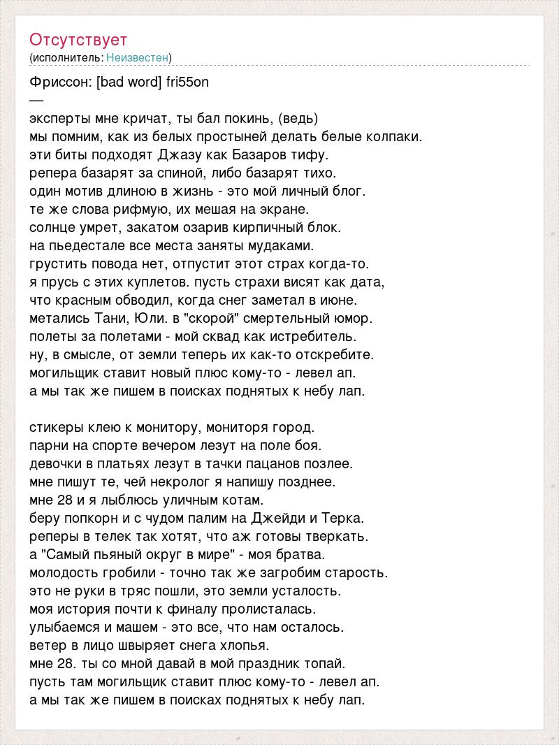 Фриссон: [bad word] fri55on — эксперты мне кричат, ты бал покинь, (ведь) мы помним, как из белых простыней делать белые колпаки. эти биты подходят Джазу как Базаров тифу. репера базарят за спиной, либо базарят тихо. один мотив длиною в жизнь - это мой личный блог. те же слова рифмую, их мешая на экране. солнце умрет, закатом озарив кирпичный блок. на пьедестале все места заняты мудаками. грустить повода нет, отпустит этот страх когда-то. я прусь с этих куплетов. пусть страхи висят как дата, что красным обводил, когда снег заметал в июне. метались Тани, Юли. в "скорой" смертельный юмор. полеты за полетами - мой сквад как истребитель. ну, в смысле, от земли теперь их как-то отскребите. могильщик ставит новый плюс кому-то - левел ап. а мы так же пишем в поисках поднятых к небу лап. стикеры клею к монитору, мониторя город. парни на спорте вечером лезут на поле боя. девочки в платьях лезут в тачки пацанов позлее. мне пишут те, чей некролог я напишу позднее. мне 28 и я лыблюсь уличным котам. беру попкорн и с чудом палим на Джейди и Терка. реперы в телек так хотят, что аж готовы тверкать. а "Самый пьяный округ в мире" - моя братва. молодость гробили - точно так же загробим старость. это не руки в тряс пошли, это земли усталость. моя история почти к финалу пролисталась. улыбаемся и машем - это все, что нам осталось. ветер в лицо швыряет снега хлопья. мне 28. ты со мной давай в мой праздник топай. пусть там могильщик ставит плюс кому-то - левел ап. а мы так же пишем в поисках поднятых к небу лап.