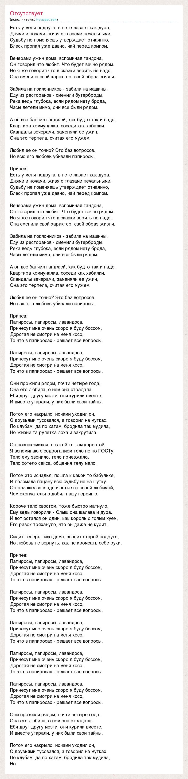 Есть у меня подруга, в нете лазает как дура, Днями и ночами, живя с глазами печальными. Судьбу не поменяешь утверждает отчаянно, Блеск пропал уже давно, чай перед компом. Вечерами ужин дома, вспоминая гандона, Он говорил что любит. Что будет вечно рядом. Но я же говорил что в сказки верить не надо, Она сменила свой характер, свой образ жизни. Забила на поклонников - забила на машины. Еду из ресторанов - сменили бутерброды. Река ведь глубока, если рядом нету брода, Часы летели мимо, они все были рядом. А он все банчил ганджей, как будто так и надо. Квартира коммуналка, соседи как хабалки. Скандалы вечерами, заменяли ее ужин, Она это терпела, считая его мужем. Любил ее он точно? Это без вопросов. Но всю его любовь убивали папиросы. Припев: Есть у меня подруга, в нете лазает как дура, Днями и ночами, живя с глазами печальными. Судьбу не поменяешь утверждает отчаянно, Блеск пропал уже давно, чай перед компом. Вечерами ужин дома, вспоминая гандона, Он говорил что любит. Что будет вечно рядом. Но я же говорил что в сказки верить не надо, Она сменила свой характер, свой образ жизни. Забила на поклонников - забила на машины. Еду из ресторанов - сменили бутерброды. Река ведь глубока, если рядом нету брода, Часы летели мимо, они все были рядом. А он все банчил ганджей, как будто так и надо. Квартира коммуналка, соседи как хабалки. Скандалы вечерами, заменяли ее ужин, Она это терпела, считая его мужем. Любил ее он точно? Это без вопросов. Но всю его любовь убивали папиросы. Припев: Папиросы, папиросы, лавандоса, Принесут мне очень скоро я буду боссом, Дорогая не смотри на меня косо, То что в папиросах - решает все вопросы. Папиросы, папиросы, лавандоса, Принесут мне очень скоро я буду боссом, Дорогая не смотри на меня косо, То что в папиросах - решает все вопросы. Они прожили рядом, почти четыре года, Она его любила, о нем она страдала. Ебя друг другу мозги, они курили вместе, И вместе угарали, у них были свои тайны. Потом его накрыло, ночами уходил он, С друзьями тусовался, а говорил на мутках. По клубам, да по хатам, бродила так мудила, Но жизни та рулетка лоха и закрутила. Он познакомился, с какой то там коростой, Я вспоминаю с содроганием тело не по ГОСТу. Тело ему звонило, тело приезжало, Тело хотело секса, общения телу мало. Потом это исчадья, пошла к какой то бабульке, И поломала пацану всю судьбу не на шутку. Он разошелся в одночастье со своей любимой, Чем окончательно добил нашу героиню. Короче тело хвостом, тоже быстро матнуло, Ему ведь говорили - Слыш она шалава и дура. И вот остался он один, как король с голым хуем, Его разок тряхануло, что он даже не курит. Сидит теперь тихо дома, звонит старой подруге, Но любовь не вернуть, как не кромсать себе руки. Припев: Папиросы, папиросы, лавандоса, Принесут мне очень скоро я буду боссом, Дорогая не смотри на меня косо, То что в папиросах - решает все вопросы. Папиросы, папиросы, лавандоса, Принесут мне очень скоро я буду боссом, Дорогая не смотри на меня косо, То что в папиросах - решает все вопросы. Папиросы, папиросы, лавандоса, Принесут мне очень скоро я буду боссом, Дорогая не смотри на меня косо, То что в папиросах - решает все вопросы. Папиросы, папиросы, лавандоса, Принесут мне очень скоро я буду боссом, Дорогая не смотри на меня косо, То что в папиросах - решает все вопросы. Папиросы, папиросы, лавандоса, Принесут мне очень скоро я буду боссом, До