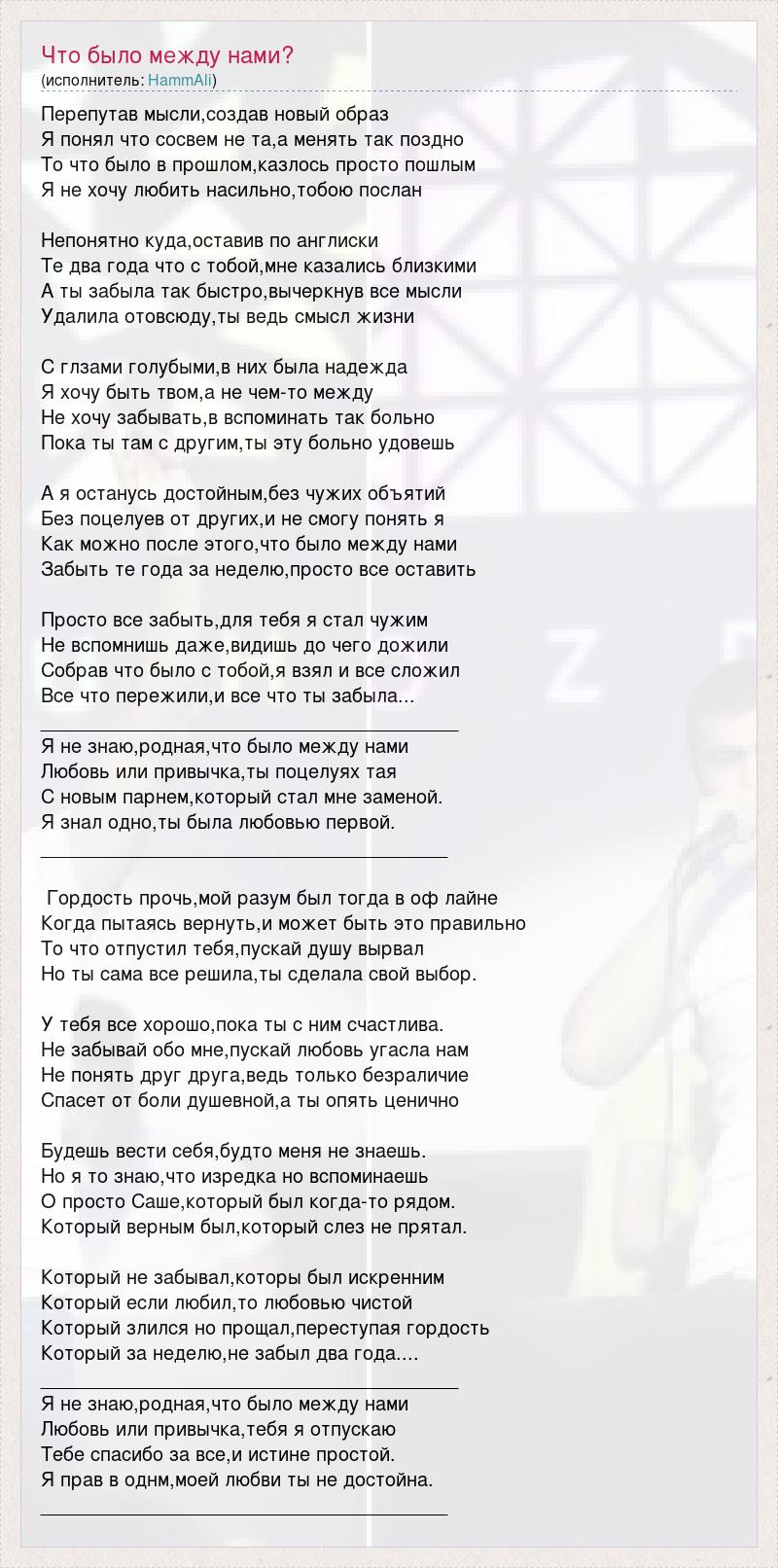 Перепутав мысли,создав новый образ Я понял что сосвем не та,а менять так поздно То что было в прошлом,казлось просто пошлым Я не хочу любить насильно,тобою послан Непонятно куда,оставив по англиски Те два года что с тобой,мне казались близкими А ты забыла так быстро,вычеркнув все мысли Удалила отовсюду,ты ведь смысл жизни С глзами голубыми,в них была надежда Я хочу быть твом,а не чем-то между Не хочу забывать,в вспоминать так больно Пока ты там с другим,ты эту больно удовешь А я останусь достойным,без чужих объятий Без поцелуев от других,и не смогу понять я Как можно после этого,что было между нами Забыть те года за неделю,просто все оставить Просто все забыть,для тебя я стал чужим Не вспомнишь даже,видишь до чего дожили Собрав что было с тобой,я взял и все сложил Все что пережили,и все что ты забыла... _______________________________________ Я не знаю,родная,что было между нами Любовь или привычка,ты поцелуях тая С новым парнем,который стал мне заменой. Я знал одно,ты была любовью первой. ______________________________________ Гордость прочь,мой разум был тогда в оф лайне Когда пытаясь вернуть,и может быть это правильно То что отпустил тебя,пускай душу вырвал Но ты сама все решила,ты сделала свой выбор. У тебя все хорошо,пока ты с ним счастлива. Не забывай обо мне,пускай любовь угасла нам Не понять друг друга,ведь только безраличие Спасет от боли душевной,а ты опять ценично Будешь вести себя,будто меня не знаешь. Но я то знаю,что изредка но вспоминаешь О просто Саше,который был когда-то рядом. Который верным был,который слез не прятал. Который не забывал,которы был искренним Который если любил,то любовью чистой Который злился но прощал,переступая гордость Который за неделю,не забыл два года.... _______________________________________ Я не знаю,родная,что было между нами Любовь или привычка,тебя я отпускаю Тебе спасибо за все,и истине простой. Я прав в однм,моей любви ты не достойна. ______________________________________
