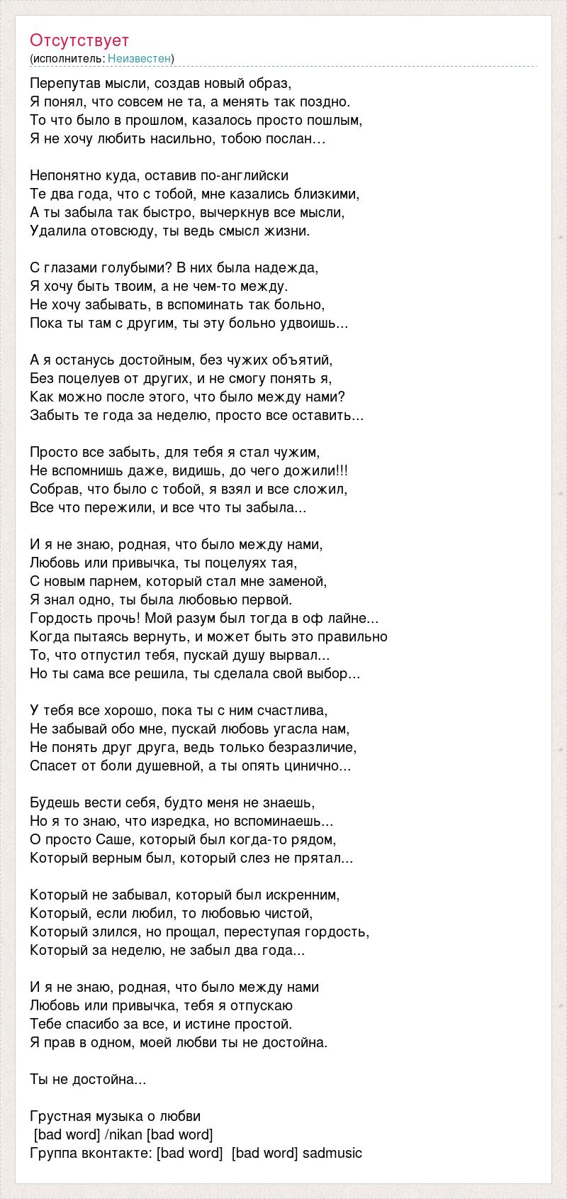 Перепутав мысли, создав новый образ, Я понял, что совсем не та, а менять так поздно. То что было в прошлом, казалось просто пошлым, Я не хочу любить насильно, тобою послан… Непонятно куда, оставив по-английски Те два года, что с тобой, мне казались близкими, А ты забыла так быстро, вычеркнув все мысли, Удалила отовсюду, ты ведь смысл жизни. С глазами голубыми? В них была надежда, Я хочу быть твоим, а не чем-то между. Не хочу забывать, в вспоминать так больно, Пока ты там с другим, ты эту больно удвоишь... А я останусь достойным, без чужих объятий, Без поцелуев от других, и не смогу понять я, Как можно после этого, что было между нами? Забыть те года за неделю, просто все оставить... Просто все забыть, для тебя я стал чужим, Не вспомнишь даже, видишь, до чего дожили!!! Собрав, что было с тобой, я взял и все сложил, Все что пережили, и все что ты забыла... И я не знаю, родная, что было между нами, Любовь или привычка, ты поцелуях тая, С новым парнем, который стал мне заменой, Я знал одно, ты была любовью первой. Гордость прочь! Мой разум был тогда в оф лайне... Когда пытаясь вернуть, и может быть это правильно То, что отпустил тебя, пускай душу вырвал... Но ты сама все решила, ты сделала свой выбор... У тебя все хорошо, пока ты с ним счастлива, Не забывай обо мне, пускай любовь угасла нам, Не понять друг друга, ведь только безразличие, Спасет от боли душевной, а ты опять цинично... Будешь вести себя, будто меня не знаешь, Но я то знаю, что изредка, но вспоминаешь... О просто Саше, который был когда-то рядом, Который верным был, который слез не прятал... Который не забывал, который был искренним, Который, если любил, то любовью чистой, Который злился, но прощал, переступая гордость, Который за неделю, не забыл два года... И я не знаю, родная, что было между нами Любовь или привычка, тебя я отпускаю Тебе спасибо за все, и истине простой. Я прав в одном, моей любви ты не достойна. Ты не достойна... Грустная музыка о любви [bad word] /nikan [bad word] Группа вконтакте: [bad word] [bad word] sadmusic