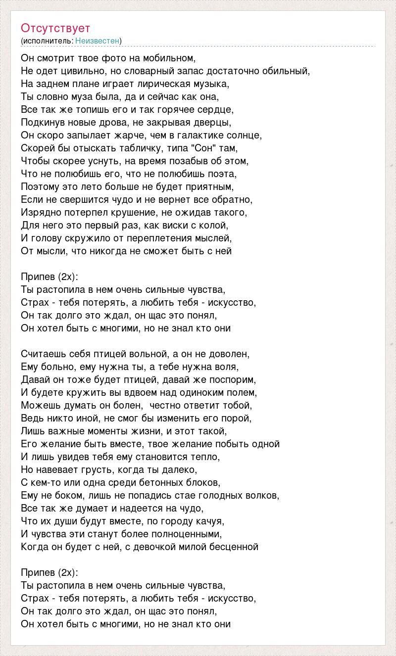 Он смотрит твое фото на мобильном, Не одет цивильно, но словарный запас достаточно обильный, На заднем плане играет лирическая музыка, Ты словно муза была, да и сейчас как она, Все так же топишь его и так горячее сердце, Подкинув новые дрова, не закрывая дверцы, Он скоро запылает жарче, чем в галактике солнце, Скорей бы отыскать табличку, типа "Сон" там, Чтобы скорее уснуть, на время позабыв об этом, Что не полюбишь его, что не полюбишь поэта, Поэтому это лето больше не будет приятным, Если не свершится чудо и не вернет все обратно, Изрядно потерпел крушение, не ожидав такого, Для него это первый раз, как виски с колой, И голову скружило от переплетения мыслей, От мысли, что никогда не сможет быть с ней Припев (2x): Ты растопила в нем очень сильные чувства, Cтрах - тебя потерять, а любить тебя - искусство, Он так долго это ждал, он щас это понял, Он хотел быть с многими, но не знал кто они Считаешь себя птицей вольной, а он не доволен, Ему больно, ему нужна ты, а тебе нужна воля, Давай он тоже будет птицей, давай же поспорим, И будете кружить вы вдвоем над одиноким полем, Можешь думать он болен, честно ответит тобой, Ведь никто иной, не смог бы изменить его порой, Лишь важные моменты жизни, и этот такой, Его желание быть вместе, твое желание побыть одной И лишь увидев тебя ему становится тепло, Но навевает грусть, когда ты далеко, С кем-то или одна среди бетонных блоков, Ему не боком, лишь не попадись стае голодных волков, Все так же думает и надеется на чудо, Что их души будут вместе, по городу качуя, И чувства эти станут более полноценными, Когда он будет с ней, с девочкой милой бесценной Припев (2x): Ты растопила в нем очень сильные чувства, Cтрах - тебя потерять, а любить тебя - искусство, Он так долго это ждал, он щас это понял, Он хотел быть с многими, но не знал кто они