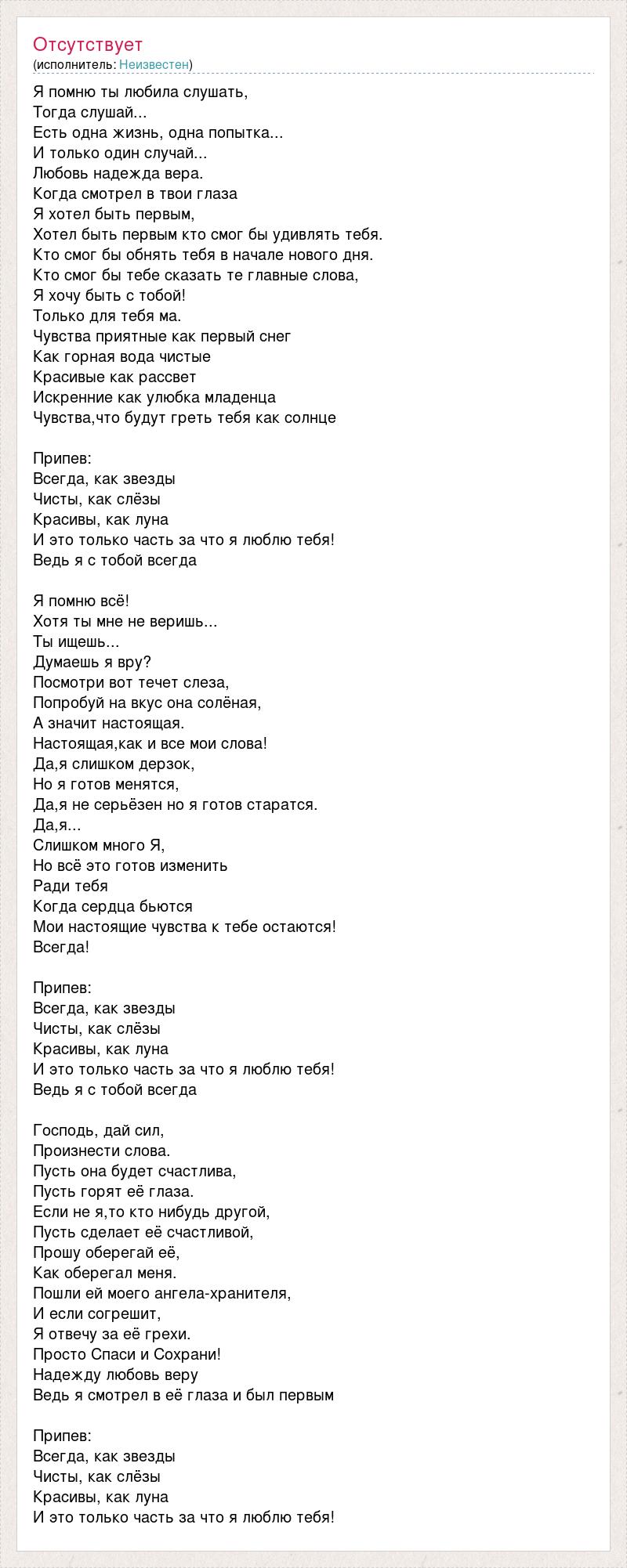Я помню ты любила слушать, Тогда слушай... Есть одна жизнь, одна попытка... И только один случай... Любовь надежда вера. Когда смотрел в твои глаза Я хотел быть первым, Хотел быть первым кто смог бы удивлять тебя. Кто смог бы обнять тебя в начале нового дня. Кто смог бы тебе сказать те главные слова, Я хочу быть с тобой! Только для тебя ма. Чувства приятные как первый снег Как горная вода чистые Красивые как рассвет Искренние как улюбка младенца Чувства,что будут греть тебя как солнце Припев: Всегда, как звезды Чисты, как слёзы Красивы, как луна И это только часть за что я люблю тебя! Ведь я с тобой всегда Я помню всё! Хотя ты мне не веришь... Ты ищешь... Думаешь я вру? Посмотри вот течет слеза, Попробуй на вкус она солёная, А значит настоящая. Настоящая,как и все мои слова! Да,я слишком дерзок, Но я готов менятся, Да,я не серьёзен но я готов старатся. Да,я... Слишком много Я, Но всё это готов изменить Ради тебя Когда сердца бьются Мои настоящие чувства к тебе остаются! Всегда! Припев: Всегда, как звезды Чисты, как слёзы Красивы, как луна И это только часть за что я люблю тебя! Ведь я с тобой всегда Господь, дай сил, Произнести слова. Пусть она будет счастлива, Пусть горят её глаза. Если не я,то кто нибудь другой, Пусть сделает её счастливой, Прошу оберегай её, Как оберегал меня. Пошли ей моего ангела-хранителя, И если согрешит, Я отвечу за её грехи. Просто Спаси и Сохрани! Надежду любовь веру Ведь я смотрел в её глаза и был первым Припев: Всегда, как звезды Чисты, как слёзы Красивы, как луна И это только часть за что я люблю тебя!