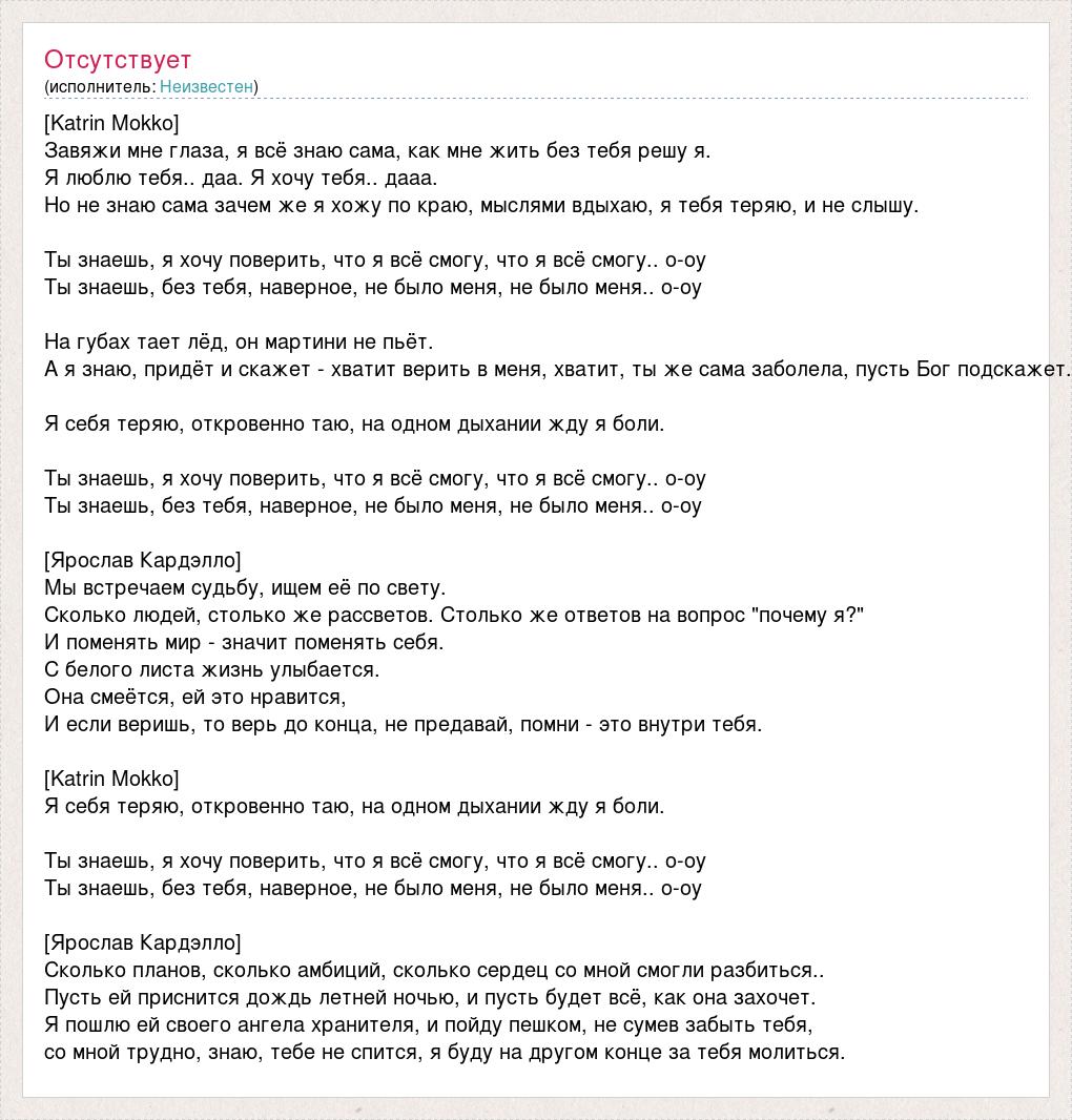 [Katrin Mokko] Завяжи мне глаза, я всё знаю сама, как мне жить без тебя решу я. Я люблю тебя.. даа. Я хочу тебя.. дааа. Но не знаю сама зачем же я хожу по краю, мыслями вдыхаю, я тебя теряю, и не слышу. Ты знаешь, я хочу поверить, что я всё смогу, что я всё смогу.. о-оу Ты знаешь, без тебя, наверное, не было меня, не было меня.. о-оу На губах тает лёд, он мартини не пьёт. А я знаю, придёт и скажет - хватит верить в меня, хватит, ты же сама заболела, пусть Бог подскажет. Я себя теряю, откровенно таю, на одном дыхании жду я боли. Ты знаешь, я хочу поверить, что я всё смогу, что я всё смогу.. о-оу Ты знаешь, без тебя, наверное, не было меня, не было меня.. о-оу [Ярослав Кардэлло] Мы встречаем судьбу, ищем её по свету. Сколько людей, столько же рассветов. Столько же ответов на вопрос "почему я?" И поменять мир - значит поменять себя. С белого листа жизнь улыбается. Она смеётся, ей это нравится, И если веришь, то верь до конца, не предавай, помни - это внутри тебя. [Katrin Mokko] Я себя теряю, откровенно таю, на одном дыхании жду я боли. Ты знаешь, я хочу поверить, что я всё смогу, что я всё смогу.. о-оу Ты знаешь, без тебя, наверное, не было меня, не было меня.. о-оу [Ярослав Кардэлло] Сколько планов, сколько амбиций, сколько сердец со мной смогли разбиться.. Пусть ей приснится дождь летней ночью, и пусть будет всё, как она захочет. Я пошлю ей своего ангела хранителя, и пойду пешком, не сумев забыть тебя, со мной трудно, знаю, тебе не спится, я буду на другом конце за тебя молиться.