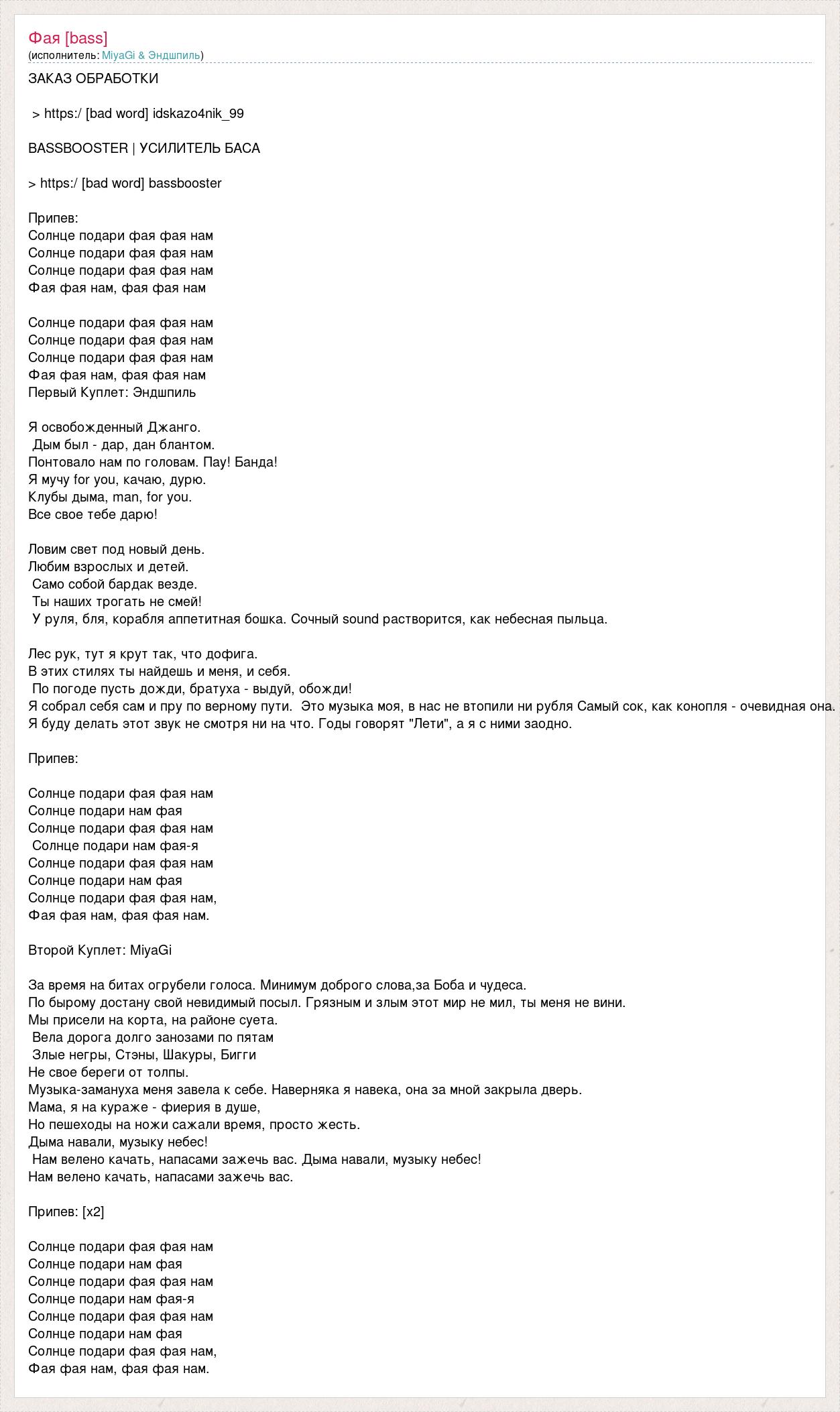ЗАКАЗ ОБРАБОТКИ > https:/ [bad word] idskazo4nik_99 BASSBOOSTER | УСИЛИТЕЛЬ БАСА > https:/ [bad word] bassbooster Припев: Солнце подари фая фая нам Солнце подари фая фая нам Солнце подари фая фая нам Фая фая нам, фая фая нам Солнце подари фая фая нам Солнце подари фая фая нам Солнце подари фая фая нам Фая фая нам, фая фая нам Первый Куплет: Эндшпиль Я освобожденный Джанго. Дым был - дар, дан блантом. Понтовало нам по головам. Пау! Банда! Я мучу for you, качаю, дурю. Клубы дыма, man, for you. Все свое тебе дарю! Ловим свет под новый день. Любим взрослых и детей. Само собой бардак везде. Ты наших трогать не смей! У руля, бля, корабля аппетитная бошка. Сочный sound растворится, как небесная пыльца. Лес рук, тут я крут так, что дофига. В этих стилях ты найдешь и меня, и себя. По погоде пусть дожди, братуха - выдуй, обожди! Я собрал себя сам и пру по верному пути. Это музыка моя, в нас не втопили ни рубля Самый сок, как конопля - очевидная она. Я буду делать этот звук не смотря ни на что. Годы говорят "Лети", а я с ними заодно. Припев: Солнце подари фая фая нам Солнце подари нам фая Солнце подари фая фая нам Солнце подари нам фая-я Солнце подари фая фая нам Солнце подари нам фая Солнце подари фая фая нам, Фая фая нам, фая фая нам. Второй Куплет: MiyaGi За время на битах огрубели голоса. Минимум доброго слова,за Боба и чудеса. По бырому достану свой невидимый посыл. Грязным и злым этот мир не мил, ты меня не вини. Мы присели на корта, на районе суета. Вела дорога долго занозами по пятам Злые негры, Стэны, Шакуры, Бигги Не свое береги от толпы. Музыка-замануха меня завела к себе. Наверняка я навека, она за мной закрыла дверь. Мама, я на кураже - фиерия в душе, Но пешеходы на ножи сажали время, просто жесть. Дыма навали, музыку небес! Нам велено качать, напасами зажечь вас. Дыма навали, музыку небес! Нам велено качать, напасами зажечь вас. Припев: [х2] Солнце подари фая фая нам Солнце подари нам фая Солнце подари фая фая нам Солнце подари нам фая-я Солнце подари фая фая нам Солнце подари нам фая Солнце подари фая фая нам, Фая фая нам, фая фая нам.