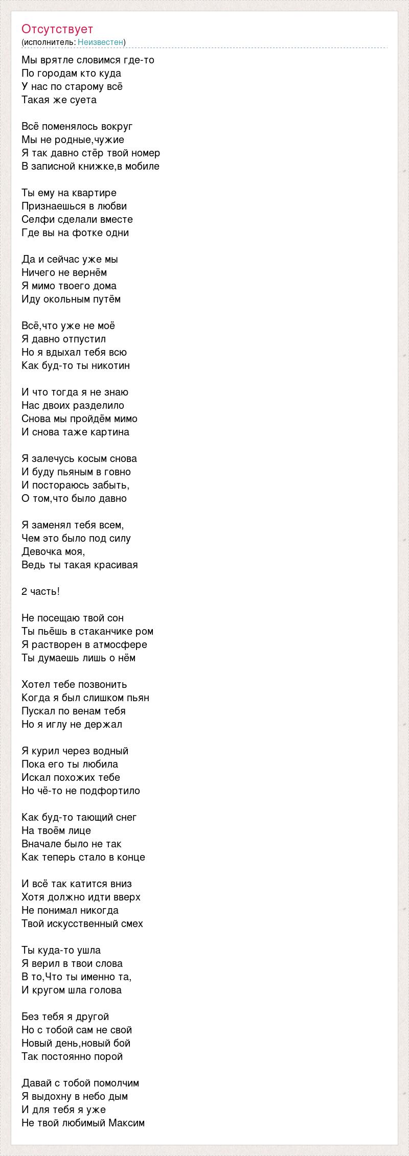 Мы врятле словимся где-то По городам кто куда У нас по старому всё Такая же суета Всё поменялось вокруг Мы не родные,чужие Я так давно стёр твой номер В записной книжке,в мобиле Ты ему на квартире Признаешься в любви Селфи сделали вместе Где вы на фотке одни Да и сейчас уже мы Ничего не вернём Я мимо твоего дома Иду окольным путём Всё,что уже не моё Я давно отпустил Но я вдыхал тебя всю Как буд-то ты никотин И что тогда я не знаю Нас двоих разделило Снова мы пройдём мимо И снова таже картина Я залечусь косым снова И буду пьяным в говно И постораюсь забыть, О том,что было давно Я заменял тебя всем, Чем это было под силу Девочка моя, Ведь ты такая красивая 2 часть! Не посещаю твой сон Ты пьёшь в стаканчике ром Я растворен в атмосфере Ты думаешь лишь о нём Хотел тебе позвонить Когда я был слишком пьян Пускал по венам тебя Но я иглу не держал Я курил через водный Пока его ты любила Искал похожих тебе Но чё-то не подфортило Как буд-то тающий снег На твоём лице Вначале было не так Как теперь стало в конце И всё так катится вниз Хотя должно идти вверх Не понимал никогда Твой искусственный смех Ты куда-то ушла Я верил в твои слова В то,Что ты именно та, И кругом шла голова Без тебя я другой Но с тобой сам не свой Новый день,новый бой Так постоянно порой Давай с тобой помолчим Я выдохну в небо дым И для тебя я уже Не твой любимый Максим