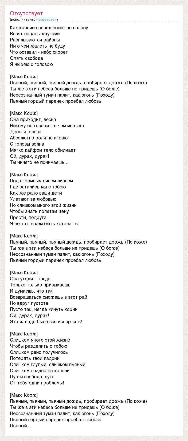 Как красиво пепел носит по салону Возят пацаны кругами Расплываются районы Ни о чем жалеть не буду Что оставил - небо скроет Опять свобода Я ныряю с головою [Макс Корж] Пьяный, пьяный, пьяный дождь, пробирает дрожь (По коже) Ты же в эти небеса больше не придешь (О боже) Неосознанный туман палит, как огонь (Походу) Пьяный гордый паренек проебал любовь [Макс Корж] Она приходит, весна Никому не говорит, о чем мечтает Деньги, слова Абсолютно роли не играют С головы волна Мягко кайфом тело обнимает Ой, дурак, дурак! Ты ничего не понимаешь... [Макс Корж] Под огромным синем ливнем Где остались мы с тобою Как же рано ваши дети Улетают за любовью Но слишком много этой жизни Чтобы знать полетам цену Прости, подруга Я не тот, с кем быть хотела ты [Макс Корж] Пьяный, пьяный, пьяный дождь, пробирает дрожь (По коже) Ты же в эти небеса больше не придешь (О боже) Неосознанный туман палит, как огонь (Походу) Пьяный гордый паренек проебал любовь [Макс Корж] Она уходит, тогда Только-только привыкаешь И думаешь, что так Возвращаться сможешь в этот рай Но вдруг пустота Пусто так, негде кинуть корни Ой, дурак, дурак! Это ж надо было все испортить! [Макс Корж] Слишком много этой жизни Чтобы разделить с тобою Слишком рано получилось Потерять твои ладони Слишком глупый, слишком пьяный Слишком поздно на колени Пусти свобода, сука От тебя одни проблемы! [Макс Корж] Пьяный, пьяный, пьяный дождь, пробирает дрожь (По коже) Ты же в эти небеса больше не придешь (О боже) Неосознанный туман палит, как огонь (Походу) Пьяный гордый паренек проебал любовь Пьяный...