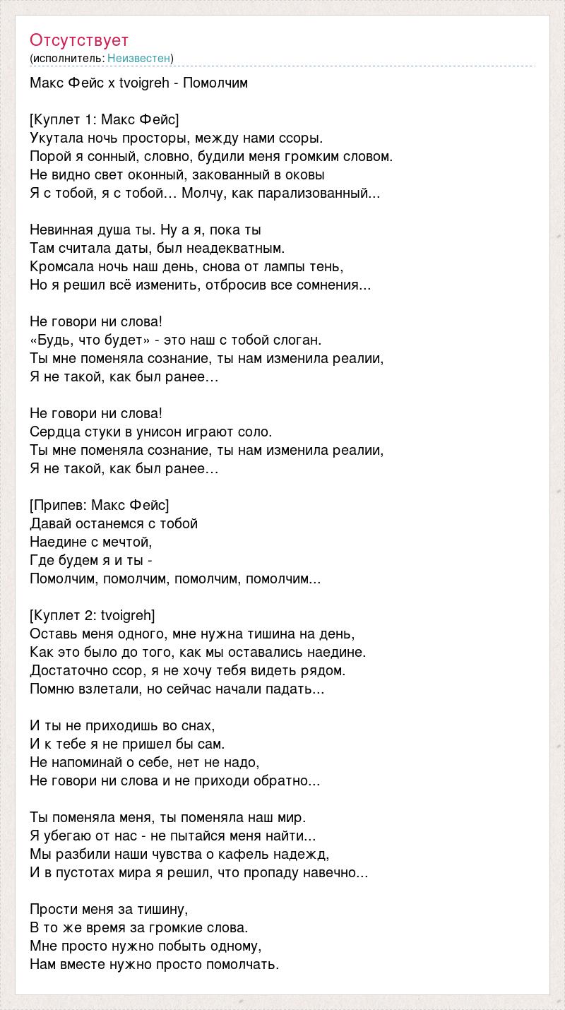 Макс Фейс x tvoigreh - Помолчим [Куплет 1: Макс Фейс] Укутала ночь просторы, между нами ссоры. Порой я сонный, словно, будили меня громким словом. Не видно свет оконный, закованный в оковы Я с тобой, я с тобой… Молчу, как парализованный... Невинная душа ты. Ну а я, пока ты Там считала даты, был неадекватным. Кромсала ночь наш день, снова от лампы тень, Но я решил всё изменить, отбросив все сомнения... Не говори ни слова! «Будь, что будет» - это наш с тобой слоган. Ты мне поменяла сознание, ты нам изменила реалии, Я не такой, как был ранее… Не говори ни слова! Сердца стуки в унисон играют соло. Ты мне поменяла сознание, ты нам изменила реалии, Я не такой, как был ранее… [Припев: Макс Фейс] Давай останемся с тобой Наедине с мечтой, Где будем я и ты - Помолчим, помолчим, помолчим, помолчим... [Куплет 2: tvoigreh] Оставь меня одного, мне нужна тишина на день, Как это было до того, как мы оставались наедине. Достаточно ссор, я не хочу тебя видеть рядом. Помню взлетали, но сейчас начали падать... И ты не приходишь во снах, И к тебе я не пришел бы сам. Не напоминай о себе, нет не надо, Не говори ни слова и не приходи обратно... Ты поменяла меня, ты поменяла наш мир. Я убегаю от нас - не пытайся меня найти... Мы разбили наши чувства о кафель надежд, И в пустотах мира я решил, что пропаду навечно... Прости меня за тишину, В то же время за громкие слова. Мне просто нужно побыть одному, Нам вместе нужно просто помолчать.