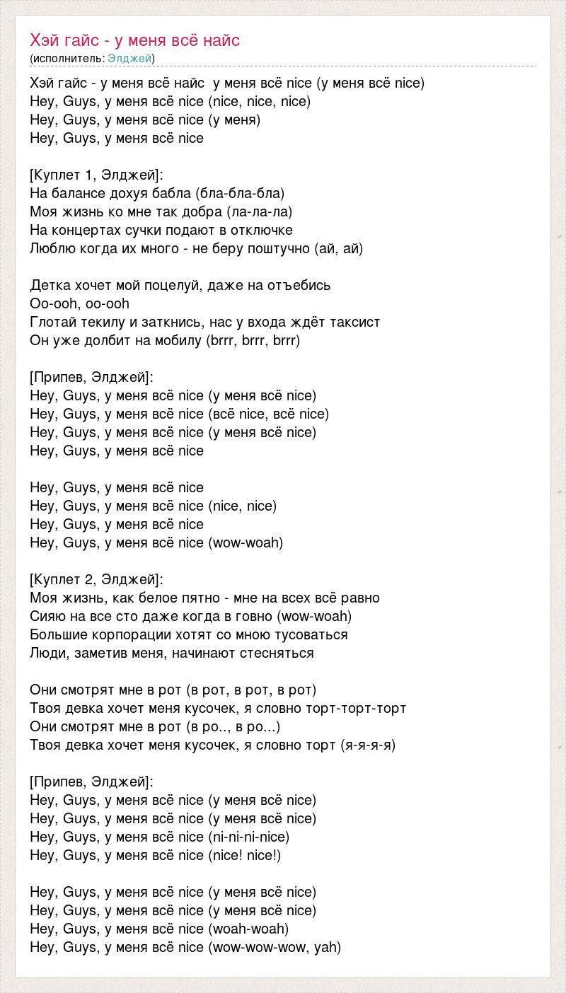 Хэй гайс - у меня всё найс у меня всё nice (у меня всё nice) Hey, Guys, у меня всё nice (nice, nice, nice) Hey, Guys, у меня всё nice (у меня) Hey, Guys, у меня всё nice [Куплет 1, Элджей]: На балансе дохуя бабла (бла-бла-бла) Моя жизнь ко мне так добра (ла-ла-ла) На концертах сучки подают в отключке Люблю когда их много - не беру поштучно (ай, ай) Детка хочет мой поцелуй, даже на отъебись Oo-ooh, oo-ooh Глотай текилу и заткнись, нас у входа ждёт таксист Он уже долбит на мобилу (brrr, brrr, brrr) [Припев, Элджей]: Hey, Guys, у меня всё nice (у меня всё nice) Hey, Guys, у меня всё nice (всё nice, всё nice) Hey, Guys, у меня всё nice (у меня всё nice) Hey, Guys, у меня всё nice Hey, Guys, у меня всё nice Hey, Guys, у меня всё nice (nice, nice) Hey, Guys, у меня всё nice Hey, Guys, у меня всё nice (wow-woah) [Куплет 2, Элджей]: Моя жизнь, как белое пятно - мне на всех всё равно Сияю на все сто даже когда в говно (wow-woah) Большие корпорации хотят со мною тусоваться Люди, заметив меня, начинают стесняться Они смотрят мне в рот (в рот, в рот, в рот) Твоя девка хочет меня кусочек, я словно торт-торт-торт Они смотрят мне в рот (в ро.., в ро...) Твоя девка хочет меня кусочек, я словно торт (я-я-я-я) [Припев, Элджей]: Hey, Guys, у меня всё nice (у меня всё nice) Hey, Guys, у меня всё nice (у меня всё nice) Hey, Guys, у меня всё nice (ni-ni-ni-nice) Hey, Guys, у меня всё nice (nice! nice!) Hey, Guys, у меня всё nice (у меня всё nice) Hey, Guys, у меня всё nice (у меня всё nice) Hey, Guys, у меня всё nice (woah-woah) Hey, Guys, у меня всё nice (wow-wow-wow, yah)