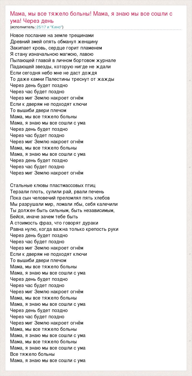 Новое послание на земле трещинами Древний змей опять обманул женщину Закипает кровь, сердце горит пламенем Я стану изначальною магмою, лавою Пылающей главой в личном бортовом журнале Падающей звезды, которую нигде не ждали Если сегодня небо мне не даст дождя То даже камни Палестины треснут от жажды Через день будет поздно Через час будет поздно Через миг Землю накроет огнём Если к дверям не подходят ключи То вышиби двери плечом Мама, мы все тяжело больны Мама, я знаю мы все сошли с ума Через день будет поздно Через час будет поздно Через миг Землю накроет огнём Мама, мы все тяжело больны Мама, я знаю мы все сошли с ума Через день будет поздно Через час будет поздно Через миг Землю накроет огнём Стальные клювы пластмассовых птиц Терзали плоть, сулили рай, рвали печень Пока сын человечий преломлял пять хлебов Мы разрушали мир, ломали лбы, себя калечили Ты должен быть сильным, быть независимым, Бейся, иначе зачем тебе быть А стоимость фраз, что говорят дураки Равна нулю, когда важна только крепость руки Через день будет поздно Через час будет поздно Через миг Землю накроет огнём Если к дверям не подходят ключи То вышиби двери плечом Мама, мы все тяжело больны Мама, я знаю мы все сошли с ума Через день будет поздно Через час будет поздно Через миг Землю накроет огнём Мама, мы все тяжело больны Мама, я знаю мы все сошли с ума Через день будет поздно Через час будет поздно Через миг Землю накроет огнём Мама, мы все тяжело больны Мама, я знаю мы все сошли с ума Мама, мы все тяжело больны Мама, я знаю мы все сошли с ума Все тяжело больны Мама, я знаю мы все сошли с ума