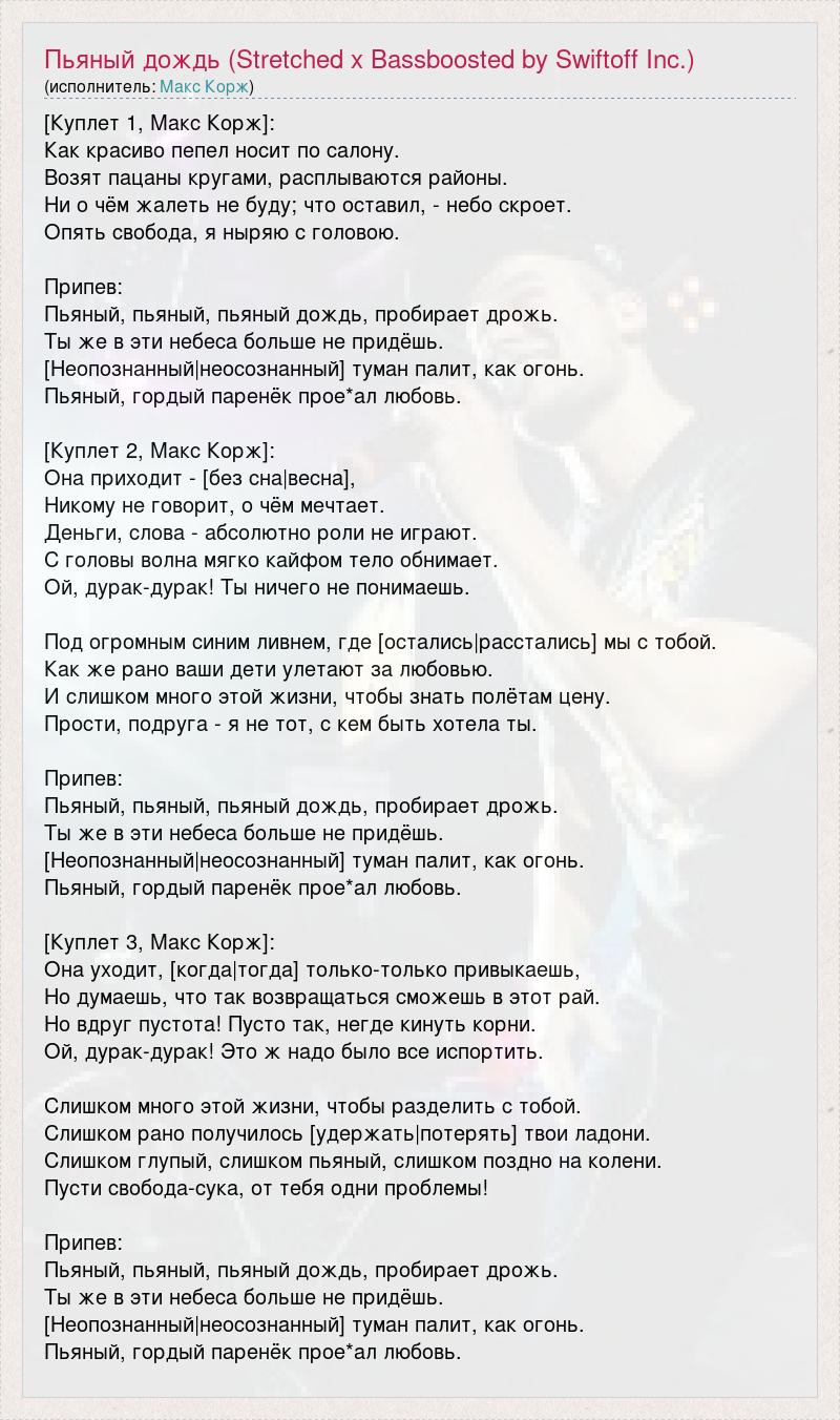[Куплет 1, Макс Корж]: Как красиво пепел носит по салону. Возят пацаны кругами, расплываются районы. Ни о чём жалеть не буду; что оставил, - небо скроет. Опять свобода, я ныряю с головою. Припев: Пьяный, пьяный, пьяный дождь, пробирает дрожь. Ты же в эти небеса больше не придёшь. [Неопознанный|неосознанный] туман палит, как огонь. Пьяный, гордый паренёк прое*ал любовь. [Куплет 2, Макс Корж]: Она приходит - [без сна|весна], Никому не говорит, о чём мечтает. Деньги, слова - абсолютно роли не играют. С головы волна мягко кайфом тело обнимает. Ой, дурак-дурак! Ты ничего не понимаешь. Под огромным синим ливнем, где [остались|расстались] мы с тобой. Как же рано ваши дети улетают за любовью. И слишком много этой жизни, чтобы знать полётам цену. Прости, подруга - я не тот, с кем быть хотела ты. Припев: Пьяный, пьяный, пьяный дождь, пробирает дрожь. Ты же в эти небеса больше не придёшь. [Неопознанный|неосознанный] туман палит, как огонь. Пьяный, гордый паренёк прое*ал любовь. [Куплет 3, Макс Корж]: Она уходит, [когда|тогда] только-только привыкаешь, Но думаешь, что так возвращаться сможешь в этот рай. Но вдруг пустота! Пусто так, негде кинуть корни. Ой, дурак-дурак! Это ж надо было все испортить. Слишком много этой жизни, чтобы разделить с тобой. Слишком рано получилось [удержать|потерять] твои ладони. Слишком глупый, слишком пьяный, слишком поздно на колени. Пусти свобода-сука, от тебя одни проблемы! Припев: Пьяный, пьяный, пьяный дождь, пробирает дрожь. Ты же в эти небеса больше не придёшь. [Неопознанный|неосознанный] туман палит, как огонь. Пьяный, гордый паренёк прое*ал любовь.