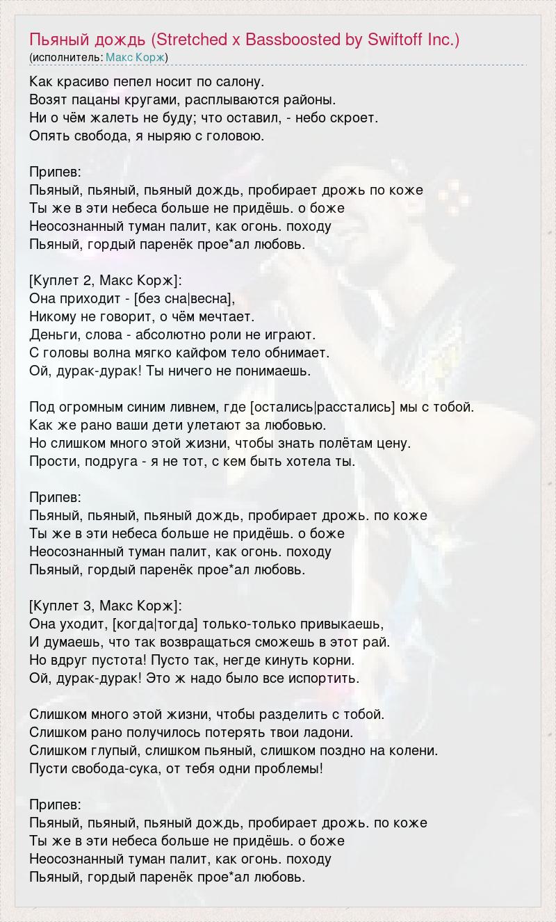 Как красиво пепел носит по салону. Возят пацаны кругами, расплываются районы. Ни о чём жалеть не буду; что оставил, - небо скроет. Опять свобода, я ныряю с головою. Припев: Пьяный, пьяный, пьяный дождь, пробирает дрожь по коже Ты же в эти небеса больше не придёшь. о боже Неосознанный туман палит, как огонь. походу Пьяный, гордый паренёк прое*ал любовь. [Куплет 2, Макс Корж]: Она приходит - [без сна|весна], Никому не говорит, о чём мечтает. Деньги, слова - абсолютно роли не играют. С головы волна мягко кайфом тело обнимает. Ой, дурак-дурак! Ты ничего не понимаешь. Под огромным синим ливнем, где [остались|расстались] мы с тобой. Как же рано ваши дети улетают за любовью. Но слишком много этой жизни, чтобы знать полётам цену. Прости, подруга - я не тот, с кем быть хотела ты. Припев: Пьяный, пьяный, пьяный дождь, пробирает дрожь. по коже Ты же в эти небеса больше не придёшь. о боже Неосознанный туман палит, как огонь. походу Пьяный, гордый паренёк прое*ал любовь. [Куплет 3, Макс Корж]: Она уходит, [когда|тогда] только-только привыкаешь, И думаешь, что так возвращаться сможешь в этот рай. Но вдруг пустота! Пусто так, негде кинуть корни. Ой, дурак-дурак! Это ж надо было все испортить. Слишком много этой жизни, чтобы разделить с тобой. Слишком рано получилось потерять твои ладони. Слишком глупый, слишком пьяный, слишком поздно на колени. Пусти свобода-сука, от тебя одни проблемы! Припев: Пьяный, пьяный, пьяный дождь, пробирает дрожь. по коже Ты же в эти небеса больше не придёшь. о боже Неосознанный туман палит, как огонь. походу Пьяный, гордый паренёк прое*ал любовь.
