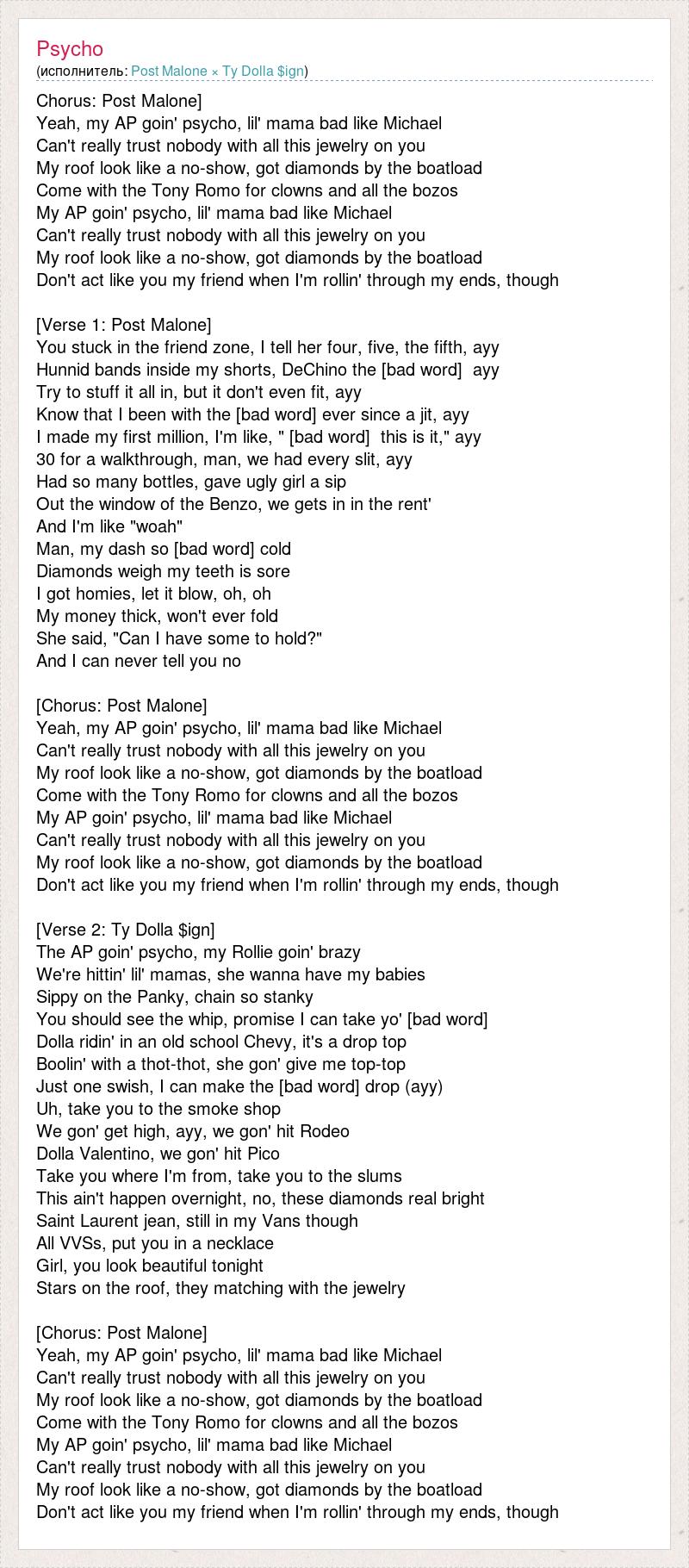 Chorus: Post Malone] Yeah, my AP goin' psycho, lil' mama bad like Michael Can't really trust nobody with all this jewelry on you My roof look like a no-show, got diamonds by the boatload Come with the Tony Romo for clowns and all the bozos My AP goin' psycho, lil' mama bad like Michael Can't really trust nobody with all this jewelry on you My roof look like a no-show, got diamonds by the boatload Don't act like you my friend when I'm rollin' through my ends, though [Verse 1: Post Malone] You stuck in the friend zone, I tell her four, five, the fifth, ayy Hunnid bands inside my shorts, DeChino the [bad word] ayy Try to stuff it all in, but it don't even fit, ayy Know that I been with the [bad word] ever since a jit, ayy I made my first million, I'm like, " [bad word] this is it," ayy 30 for a walkthrough, man, we had every slit, ayy Had so many bottles, gave ugly girl a sip Out the window of the Benzo, we gets in in the rent' And I'm like "woah" Man, my dash so [bad word] cold Diamonds weigh my teeth is sore I got homies, let it blow, oh, oh My money thick, won't ever fold She said, "Can I have some to hold?" And I can never tell you no [Chorus: Post Malone] Yeah, my AP goin' psycho, lil' mama bad like Michael Can't really trust nobody with all this jewelry on you My roof look like a no-show, got diamonds by the boatload Come with the Tony Romo for clowns and all the bozos My AP goin' psycho, lil' mama bad like Michael Can't really trust nobody with all this jewelry on you My roof look like a no-show, got diamonds by the boatload Don't act like you my friend when I'm rollin' through my ends, though [Verse 2: Ty Dolla $ign] The AP goin' psycho, my Rollie goin' brazy We're hittin' lil' mamas, she wanna have my babies Sippy on the Panky, chain so stanky You should see the whip, promise I can take yo' [bad word] Dolla ridin' in an old school Chevy, it's a drop top Boolin' with a thot-thot, she gon' give me top-top Just one swish, I can make the [bad word] drop (ayy) Uh, take you to the smoke shop We gon' get high, ayy, we gon' hit Rodeo Dolla Valentino, we gon' hit Pico Take you where I'm from, take you to the slums This ain't happen overnight, no, these diamonds real bright Saint Laurent jean, still in my Vans though All VVSs, put you in a necklace Girl, you look beautiful tonight Stars on the roof, they matching with the jewelry [Chorus: Post Malone] Yeah, my AP goin' psycho, lil' mama bad like Michael Can't really trust nobody with all this jewelry on you My roof look like a no-show, got diamonds by the boatload Come with the Tony Romo for clowns and all the bozos My AP goin' psycho, lil' mama bad like Michael Can't really trust nobody with all this jewelry on you My roof look like a no-show, got diamonds by the boatload Don't act like you my friend when I'm rollin' through my ends, though