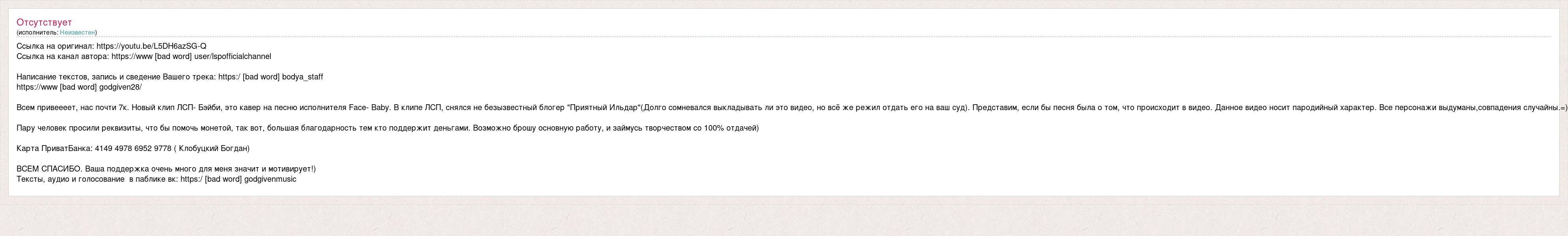 Ссылка на оригинал: https://youtu.be/L5DH6azSG-Q Ссылка на канал автора: https://www [bad word] user/lspofficialchannel Написание текстов, запись и сведение Вашего трека: https:/ [bad word] bodya_staff https://www [bad word] godgiven28/ Всем привеееет, нас почти 7к. Новый клип ЛСП- Бэйби, это кавер на песню исполнителя Face- Baby. В клипе ЛСП, снялся не безызвестный блогер "Приятный Ильдар"(Долго сомневался выкладывать ли это видео, но всё же режил отдать его на ваш суд). Представим, если бы песня была о том, что происходит в видео. Данное видео носит пародийный характер. Все персонажи выдуманы,совпадения случайны.=) Пару человек просили реквизиты, что бы помочь монетой, так вот, большая благодарность тем кто поддержит деньгами. Возможно брошу основную работу, и займусь творчеством со 100% отдачей) Карта ПриватБанка: 4149 4978 6952 9778 ( Клобуцкий Богдан) ВСЕМ СПАСИБО. Ваша поддержка очень много для меня значит и мотивирует!) Тексты, аудио и голосование в паблике вк: https:/ [bad word] godgivenmusic