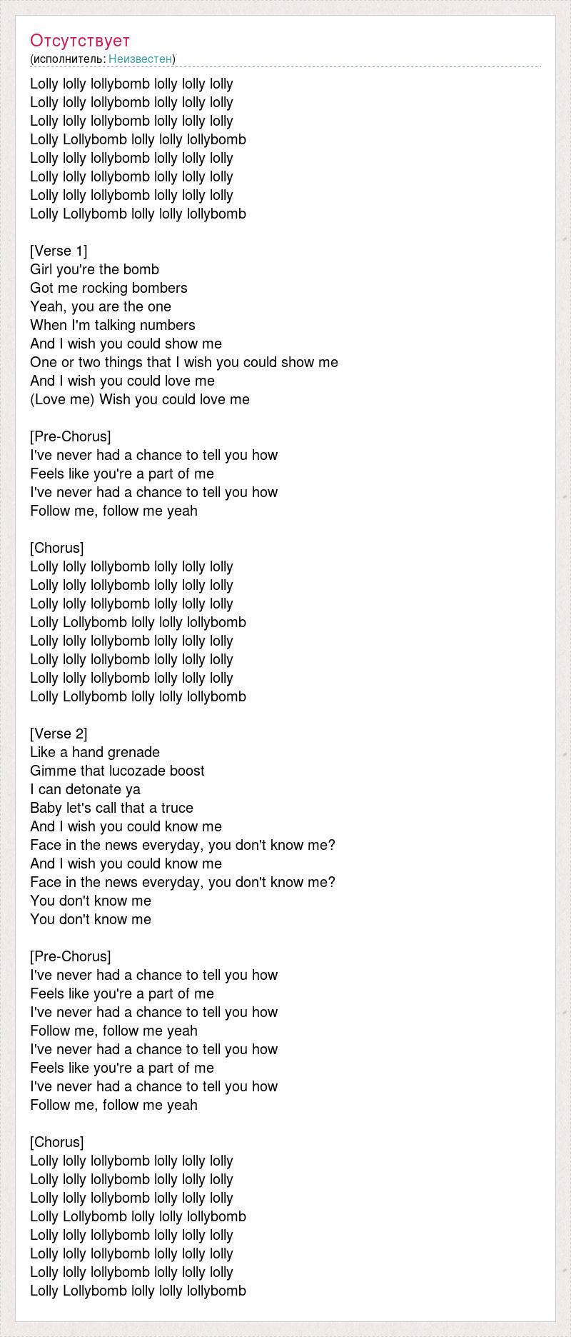 Lolly lolly lollybomb lolly lolly lolly Lolly lolly lollybomb lolly lolly lolly Lolly lolly lollybomb lolly lolly lolly Lolly Lollybomb lolly lolly lollybomb Lolly lolly lollybomb lolly lolly lolly Lolly lolly lollybomb lolly lolly lolly Lolly lolly lollybomb lolly lolly lolly Lolly Lollybomb lolly lolly lollybomb [Verse 1] Girl you're the bomb Got me rocking bombers Yeah, you are the one When I'm talking numbers And I wish you could show me One or two things that I wish you could show me And I wish you could love me (Love me) Wish you could love me [Pre-Chorus] I've never had a chance to tell you how Feels like you're a part of me I've never had a chance to tell you how Follow me, follow me yeah [Chorus] Lolly lolly lollybomb lolly lolly lolly Lolly lolly lollybomb lolly lolly lolly Lolly lolly lollybomb lolly lolly lolly Lolly Lollybomb lolly lolly lollybomb Lolly lolly lollybomb lolly lolly lolly Lolly lolly lollybomb lolly lolly lolly Lolly lolly lollybomb lolly lolly lolly Lolly Lollybomb lolly lolly lollybomb [Verse 2] Like a hand grenade Gimme that lucozade boost I can detonate ya Baby let's call that a truce And I wish you could know me Face in the news everyday, you don't know me? And I wish you could know me Face in the news everyday, you don't know me? You don't know me You don't know me [Pre-Chorus] I've never had a chance to tell you how Feels like you're a part of me I've never had a chance to tell you how Follow me, follow me yeah I've never had a chance to tell you how Feels like you're a part of me I've never had a chance to tell you how Follow me, follow me yeah [Chorus] Lolly lolly lollybomb lolly lolly lolly Lolly lolly lollybomb lolly lolly lolly Lolly lolly lollybomb lolly lolly lolly Lolly Lollybomb lolly lolly lollybomb Lolly lolly lollybomb lolly lolly lolly Lolly lolly lollybomb lolly lolly lolly Lolly lolly lollybomb lolly lolly lolly Lolly Lollybomb lolly lolly lollybomb