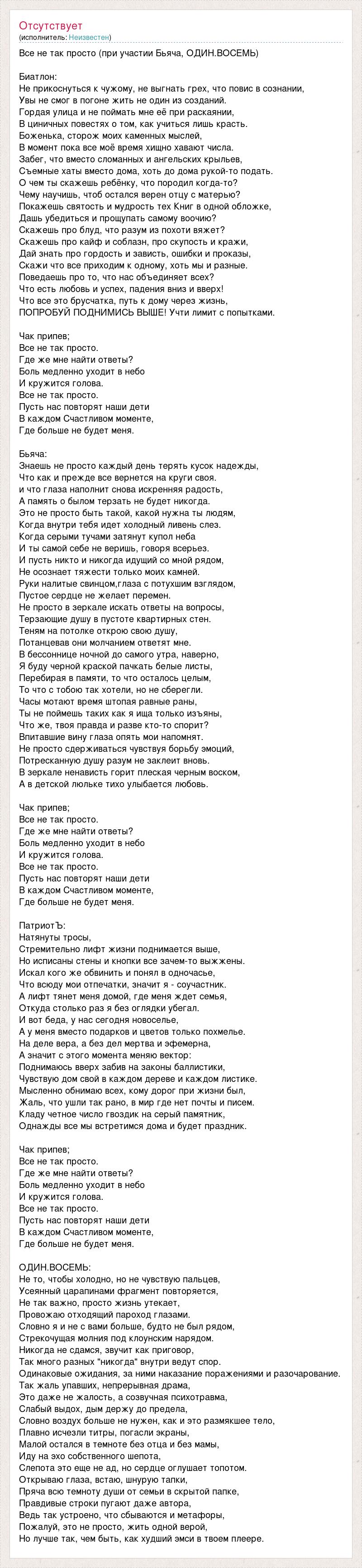 Все не так просто (при участии Бьяча, ОДИН.ВОСЕМЬ) Биатлон: Не прикоснуться к чужому, не выгнать грех, что повис в сознании, Увы не смог в погоне жить не один из созданий. Гордая улица и не поймать мне её при раскаянии, В циничных повестях о том, как учиться лишь красть. Боженька, сторож моих каменных мыслей, В момент пока все моё время хищно хавают числа. Забег, что вместо сломанных и ангельских крыльев, Съемные хаты вместо дома, хоть до дома рукой-то подать. О чем ты скажешь ребёнку, что породил когда-то? Чему научишь, чтоб остался верен отцу с матерью? Покажешь святость и мудрость тех Книг в одной обложке, Дашь убедиться и прощупать самому воочию? Скажешь про блуд, что разум из похоти вяжет? Скажешь про кайф и соблазн, про скупость и кражи, Дай знать про гордость и зависть, ошибки и проказы, Скажи что все приходим к одному, хоть мы и разные. Поведаешь про то, что нас объединяет всех? Что есть любовь и успех, падения вниз и вверх! Что все это брусчатка, путь к дому через жизнь, ПОПРОБУЙ ПОДНИМИСЬ ВЫШЕ! Учти лимит с попытками. Чак припев; Все не так просто. Где же мне найти ответы? Боль медленно уходит в небо И кружится голова. Все не так просто. Пусть нас повторят наши дети В каждом Счастливом моменте, Где больше не будет меня. Бьяча: Знаешь не просто каждый день терять кусок надежды, Что как и прежде все вернется на круги своя. и что глаза наполнит снова искренняя радость, А память о былом терзать не будет никогда. Это не просто быть такой, какой нужна ты людям, Когда внутри тебя идет холодный ливень слез. Когда серыми тучами затянут купол неба И ты самой себе не веришь, говоря всерьез. И пусть никто и никогда идущий со мной рядом, Не осознает тяжести только моих камней. Руки налитые свинцом,глаза с потухшим взглядом, Пустое сердце не желает перемен. Не просто в зеркале искать ответы на вопросы, Терзающие душу в пустоте квартирных стен. Теням на потолке открою свою душу, Потанцевав они молчанием ответят мне. В бессоннице ночной до самого утра, наверно, Я буду черной краской пачкать белые листы, Перебирая в памяти, то что осталось целым, То что с тобою так хотели, но не сберегли. Часы мотают время штопая равные раны, Ты не поймешь таких как я ища только изъяны, Что же, твоя правда и разве кто-то спорит? Впитавшие вину глаза опять мои напомнят. Не просто сдерживаться чувствуя борьбу эмоций, Потресканную душу разум не заклеит вновь. В зеркале ненависть горит плеская черным воском, А в детской люльке тихо улыбается любовь. Чак припев; Все не так просто. Где же мне найти ответы? Боль медленно уходит в небо И кружится голова. Все не так просто. Пусть нас повторят наши дети В каждом Счастливом моменте, Где больше не будет меня. ПатриотЪ: Натянуты тросы, Стремительно лифт жизни поднимается выше, Но исписаны стены и кнопки все зачем-то выжжены. Искал кого же обвинить и понял в одночасье, Что всюду мои отпечатки, значит я - соучастник. А лифт тянет меня домой, где меня ждет семья, Откуда столько раз я без оглядки убегал. И вот беда, у нас сегодня новоселье, А у меня вместо подарков и цветов только похмелье. На деле вера, а без дел мертва и эфемерна, А значит с этого момента меняю вектор: Поднимаюсь вверх забив на законы баллистики, Чувствую дом свой в каждом дереве и каждом листике. Мысленно обнимаю всех, кому дорог при жизни был, Жаль, что ушли так рано, в мир где нет почты и писем. Кла