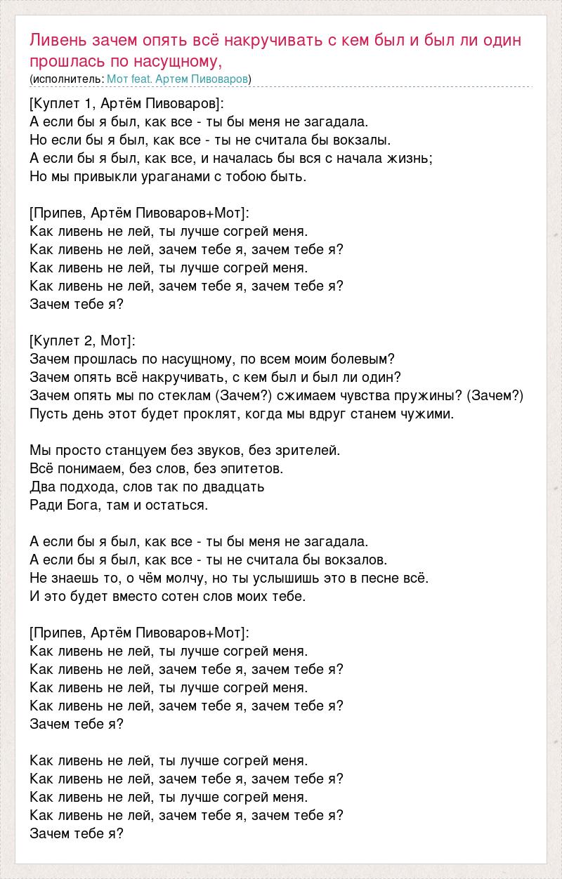 [Куплет 1, Артём Пивоваров]: А если бы я был, как все - ты бы меня не загадала. Но если бы я был, как все - ты не считала бы вокзалы. А если бы я был, как все, и началась бы вся с начала жизнь; Но мы привыкли ураганами с тобою быть. [Припев, Артём Пивоваров+Мот]: Как ливень не лей, ты лучше согрей меня. Как ливень не лей, зачем тебе я, зачем тебе я? Как ливень не лей, ты лучше согрей меня. Как ливень не лей, зачем тебе я, зачем тебе я? Зачем тебе я? [Куплет 2, Мот]: Зачем прошлась по насущному, по всем моим болевым? Зачем опять всё накручивать, с кем был и был ли один? Зачем опять мы по стеклам (Зачем?) сжимаем чувства пружины? (Зачем?) Пусть день этот будет проклят, когда мы вдруг станем чужими. Мы просто станцуем без звуков, без зрителей. Всё понимаем, без слов, без эпитетов. Два подхода, слов так по двадцать Ради Бога, там и остаться. А если бы я был, как все - ты бы меня не загадала. А если бы я был, как все - ты не считала бы вокзалов. Не знаешь то, о чём молчу, но ты услышишь это в песне всё. И это будет вместо сотен слов моих тебе. [Припев, Артём Пивоваров+Мот]: Как ливень не лей, ты лучше согрей меня. Как ливень не лей, зачем тебе я, зачем тебе я? Как ливень не лей, ты лучше согрей меня. Как ливень не лей, зачем тебе я, зачем тебе я? Зачем тебе я? Как ливень не лей, ты лучше согрей меня. Как ливень не лей, зачем тебе я, зачем тебе я? Как ливень не лей, ты лучше согрей меня. Как ливень не лей, зачем тебе я, зачем тебе я? Зачем тебе я?