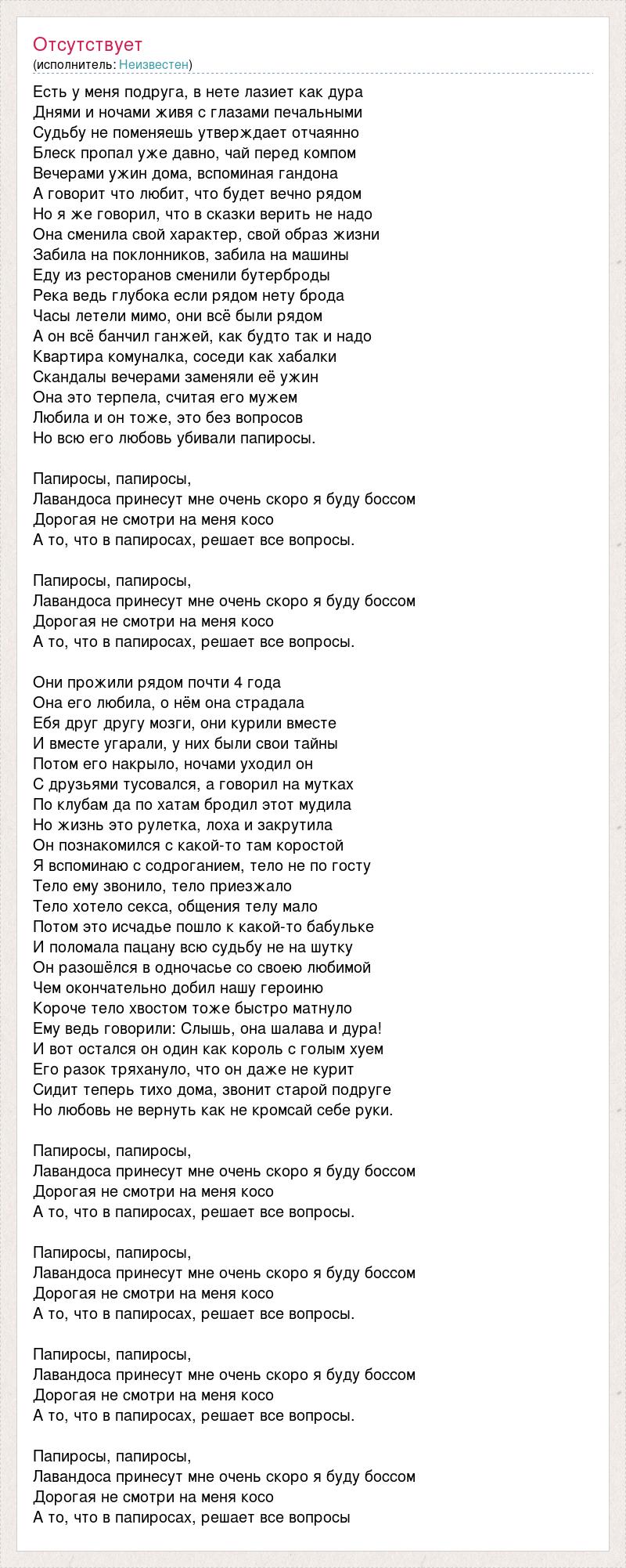 Есть у меня подруга, в нете лазиет как дура Днями и ночами живя с глазами печальными Судьбу не поменяешь утверждает отчаянно Блеск пропал уже давно, чай перед компом Вечерами ужин дома, вспоминая гандона А говорит что любит, что будет вечно рядом Но я же говорил, что в сказки верить не надо Она сменила свой характер, свой образ жизни Забила на поклонников, забила на машины Еду из ресторанов сменили бутерброды Река ведь глубока если рядом нету брода Часы летели мимо, они всё были рядом А он всё банчил ганжей, как будто так и надо Квартира комуналка, соседи как хабалки Скандалы вечерами заменяли её ужин Она это терпела, считая его мужем Любила и он тоже, это без вопросов Но всю его любовь убивали папиросы. Папиросы, папиросы, Лавандоса принесут мне очень скоро я буду боссом Дорогая не смотри на меня косо А то, что в папиросах, решает все вопросы. Папиросы, папиросы, Лавандоса принесут мне очень скоро я буду боссом Дорогая не смотри на меня косо А то, что в папиросах, решает все вопросы. Они прожили рядом почти 4 года Она его любила, о нём она страдала Ебя друг другу мозги, они курили вместе И вместе угарали, у них были свои тайны Потом его накрыло, ночами уходил он С друзьями тусовался, а говорил на мутках По клубам да по хатам бродил этот мудила Но жизнь это рулетка, лоха и закрутила Он познакомился с какой-то там коростой Я вспоминаю с содроганием, тело не по госту Тело ему звонило, тело приезжало Тело хотело секса, общения телу мало Потом это исчадье пошло к какой-то бабульке И поломала пацану всю судьбу не на шутку Он разошёлся в одночасье со своею любимой Чем окончательно добил нашу героиню Короче тело хвостом тоже быстро матнуло Ему ведь говорили: Слышь, она шалава и дура! И вот остался он один как король с голым хуем Его разок тряхануло, что он даже не курит Сидит теперь тихо дома, звонит старой подруге Но любовь не вернуть как не кромсай себе руки. Папиросы, папиросы, Лавандоса принесут мне очень скоро я буду боссом Дорогая не смотри на меня косо А то, что в папиросах, решает все вопросы. Папиросы, папиросы, Лавандоса принесут мне очень скоро я буду боссом Дорогая не смотри на меня косо А то, что в папиросах, решает все вопросы. Папиросы, папиросы, Лавандоса принесут мне очень скоро я буду боссом Дорогая не смотри на меня косо А то, что в папиросах, решает все вопросы. Папиросы, папиросы, Лавандоса принесут мне очень скоро я буду боссом Дорогая не смотри на меня косо А то, что в папиросах, решает все вопросы