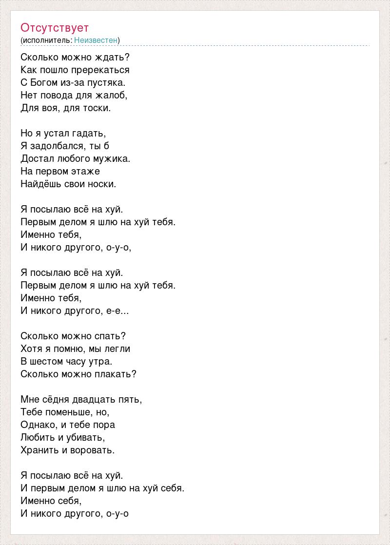 Сколько можно ждать? Как пошло пререкаться С Богом из-за пустяка. Нет повода для жалоб, Для воя, для тоски. Но я устал гадать, Я задолбался, ты б Достал любого мужика. На первом этаже Найдёшь свои носки. Я посылаю всё на хуй. Первым делом я шлю на хуй тебя. Именно тебя, И никого другого, о-у-о, Я посылаю всё на хуй. Первым делом я шлю на хуй тебя. Именно тебя, И никого другого, е-е... Сколько можно спать? Хотя я помню, мы легли В шестом часу утра. Сколько можно плакать? Мне сёдня двадцать пять, Тебе поменьше, но, Однако, и тебе пора Любить и убивать, Хранить и воровать. Я посылаю всё на хуй. И первым делом я шлю на хуй себя. Именно себя, И никого другого, о-у-о