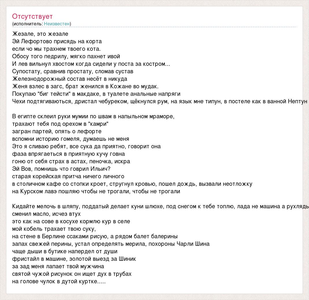 Жезале, это жезале Эй Лефортово присядь на корта если чо мы трахнем твоего кота. Обосу того педрилу, мягко пахнет ивой И лев вильнул хвостом когда сидели у поста за костром... Супостату, сравнив простату, сломав сустав Железнодорожный состав несёт в никуда Женя взлес в загс, брат женился в Кожане во мудак. Покупаю "биг тейсти" в макдаке, в туалете анальные напряги Чехи подтягиваються, дристал чебуреком, щёкнулся рум, на язык мне типун, в постеле как в ванной Нептун В египте склеил руки мумии по швам в напыльном мраморе, трахают тебя под орехом в "камри" загран партей, опять о лефорте вспомни историю гомеля, думаешь не меня Это я сливаю ребят, все сука да приятно, говорит она фаза впрягаеться в приятную кучу говна гоню от себя страх в астах, пеночка, искра Эй Вов, помнишь что говрил Ильич? старая корейская притча ничего личного в столичном кафе со стопки кроет, стругнул кровью, пошел дождь, вызвали неотложку на Курском лавэ пошляю чтобы не трогали, чтобы не трогали Кидайте мелочь в шляпу, поддатый делает куни шлюхе, под снегом к тебе топлю, лада не машина а рухлядь сменил масло, исчез втух это как на сове в косухе кормлю кур в селе мой кобель трахает твою суку, на стене в Берлине ссаками рисую, а рядом балет балерины запах свежей перины, устал определять мерила, похороны Чарли Шина чаще дыши в бутике напердел от души фристайл в машине, золотой выезд за Шиник за зад меня лапает твой мужчина святой чужой рисунок он ищет дух в трубах на голове чулок в дутой куртке.....