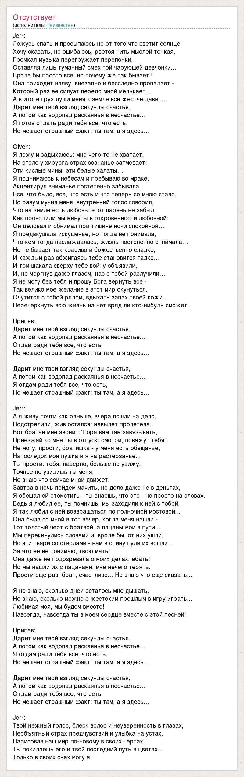 Jerr: Ложусь спать и просыпаюсь не от того что светит солнце, Хочу сказать, но ошибаюсь, рвется нить мыслей тонкая, Громкая музыка перегружает перепонки, Оставляя лишь туманный смех той чарующей девчонки... Вроде бы просто все, но почему же так бывает? Она приходит наяву, внезапно и бесследно пропадает - Который раз ее силуэт передо мной мелькает… А в итоге груз души меня к земле все жестче давит… Дарит мне твой взгляд секунды счастья, А потом как водопад раскаянья в несчастье… Я готов отдать ради тебя все, что есть, Но мешает страшный факт: ты там, а я здесь… Olven: Я лежу и задыхаюсь: мне чего-то не хватает. На столе у хирурга страх сознанье затмевает: Эти кислые мины, эти белые халаты… Я поднимаюсь к небесам и пребываю во мраке, Акцентируя вниманье постепенно забывала Все, что было, все, что есть и что теперь со мною стало, Но разум мучил меня, внутренний голос говорил, Что на земле есть любовь: этот парень не забыл, Как проводили мы минуты в откровенности любовной: Он целовал и обнимал при тишине ночи спокойной… Я предвкушала искушенье, но тогда не понимала, Что кем тогда наслаждалась, жизнь постепенно отнимала… Но не бывает так красиво и божественно сладко, И каждый раз обжигаясь тебе становится гадко… И три шакала сверху тебе войну объявили, И, не моргнув даже глазом, нас с тобой разлучили… Я не могу без тебя и прошу Бога вернуть все - Так велико мое желание в этот мир окунуться, Очутится с тобой рядом, вдыхать запах твоей кожи… Перечеркнуть всю жизнь на нет вряд ли кто-нибудь сможет.. Припев: Дарит мне твой взгляд секунды счастья, А потом как водопад раскаянья в несчастье... Отдам ради тебя все, что есть, Но мешает страшный факт: ты там, а я здесь... Дарит мне твой взгляд секунды счастья, А потом как водопад раскаянья в несчастье... Я отдам ради тебя все, что есть, Но мешает страшный факт: ты там, а я здесь... Jerr: А я живу почти как раньше, вчера пошли на дело, Подстрелили, жив остался: навылет пролетела.. Вот братан мне звонит:"Пора вам там завязывать, Приезжай ко мне ты в отпуск; смотри, повяжут тебя". Не могу, прости, братишка - у меня есть обещанье, Напоследок моя пушка и я на растерзанье... Ты прости: тебя, наверно, больше не увижу, Точнее не увидишь ты меня, Не знаю что сейчас мной движет. Завтра в ночь пойдем мачить, но дело даже не в деньгах, Я обещал ей отомстить - ты знаешь, что это - не просто на словах. Ведь я любил ее, ты помнишь, мы заходили к ней с тобой, Я так любил с ней возвращаться по полночной мостовой... Она была со мной в тот вечер, когда меня нашли - Тот толстый черт с братвой, а пацаны мои в пути... Мы перекинулись словами и, вроде бы, от них ушли, Но эти твари со стволами - нам в спину пули их вошли... За что ее не понимаю, твою мать! Она даже не подозревала о моих делах, ебать! Но мы нашли их с пацанами, мне нечего терять. Прости еще раз, брат, счастливо... Не знаю что еще сказать... Я не знаю, сколько дней осталось мне дышать, Не знаю, сколько можно с жестоким прошлым в игру играть... Любимая моя, мы будем вместе! Навсегда, навсегда ты в моем сердце вместе с этой песней! Припев: Дарит мне твой взгляд секунды счастья, А потом как водопад раскаянья в несчастье... Я отдам ради тебя все, что есть, Но мешает страшный факт: ты там, а я здесь... Дарит мне твой взгляд секунды счастья, А потом как водопад раскаянья в несчастье... Отдам ради тебя все, что есть, Но мешает страшный факт: ты т