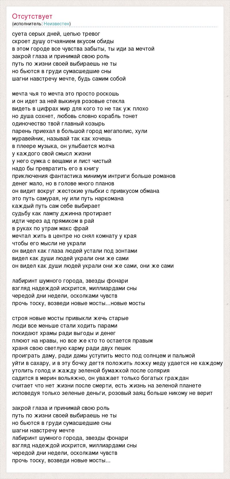 суета серых дней, цепью тревог скроет душу отчаянием вкусом обиды в этом городе все чувства забыты, ты иди за мечтой закрой глаза и принимай свою роль путь по жизни своей выбираешь не ты но бьются в груди сумасшедшие сны шагни навстречу мечте, будь самим собой мечта чья то мечта это просто роскошь и он идет за ней выкинув розовые стекла видеть в цифрах мир для кого то не так уж плохо но душа сохнет, любовь словно корабль тонет одиночество твой главный козырь парень приехал в большой город мегаполис, хули муравейник, называй так как хочешь в плеере музыка, он улыбается молча у каждого свой смысл жизни у него сумка с вещами и лист чистый надо бы превратить его в книгу приключения фантастика минимум интриги больше романов денег мало, но в голове много планов он видит вокруг жестокие улыбки с привкусом обмана это путь самурая, ну или путь наркомана каждый путь сам себе выбирает судьбу как лампу джинна протирает идти через ад прямиком в рай в руках по утрам макс фрай мечтал жить в центре но снял комнату у края чтобы его мысли не украли он видел как глаза людей устали под зонтами видел как души людей украли они же сами он видел как души людей украли они же сами, они же сами лабиринт шумного города, звезды фонари взгляд надеждой искрится, миллиардами сны чередой дни недели, осколками чувств прочь тоску, возведи новые мосты...новые мосты строя новые мосты привыкли жечь старые люди все меньше стали ходить парами покидают храмы ради выгоды и денег плюют на нравы, но все же кто то остается правым храня свою светлую карму ради двух пешек проиграть даму, ради дамы уступить место под солнцем и пальмой уйти в сахару, и в эту бочку дегтя положить ложку меду удается не каждому утолить голод и жажду зеленой бумажкой после солярия садится в мерин вольяжно, он уважает только богатых граждан считает что нет жизни после смерти, есть жизнь на зеленой планете исповедуя только зеленые деньги, розовый заяц больше никому не верит закрой глаза и принимай свою роль путь по жизни своей выбираешь не ты но бьются в груди сумасшедшие сны шагни навстречу мечте лабиринт шумного города, звезды фонари взгляд надеждой искрится, миллиардами сны чередой дни недели, осколками чувств прочь тоску, возведи новые мосты...