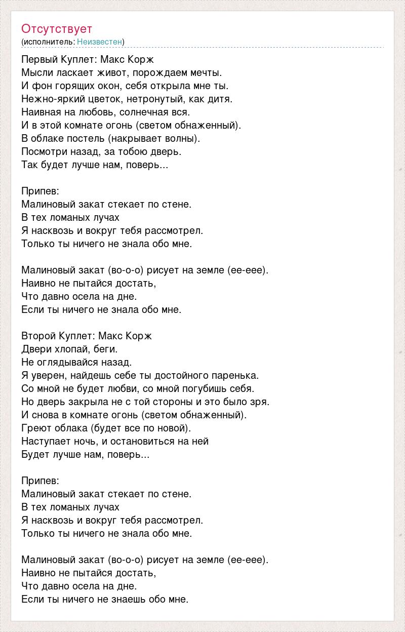 Первый Куплет: Макс Корж Мысли ласкает живот, порождаем мечты. И фон горящих окон, себя открыла мне ты. Нежно-яркий цветок, нетронутый, как дитя. Наивная на любовь, солнечная вся. И в этой комнате огонь (светом обнаженный). В облаке постель (накрывает волны). Посмотри назад, за тобою дверь. Так будет лучше нам, поверь... Припев: Малиновый закат стекает по стене. В тех ломаных лучах Я насквозь и вокруг тебя рассмотрел. Только ты ничего не знала обо мне. Малиновый закат (во-о-о) рисует на земле (ее-еее). Наивно не пытайся достать, Что давно осела на дне. Если ты ничего не знала обо мне. Второй Куплет: Макс Корж Двери хлопай, беги. Не оглядывайся назад. Я уверен, найдешь себе ты достойного паренька. Со мной не будет любви, со мной погубишь себя. Но дверь закрыла не с той стороны и это было зря. И снова в комнате огонь (светом обнаженный). Греют облака (будет все по новой). Наступает ночь, и остановиться на ней Будет лучше нам, поверь... Припев: Малиновый закат стекает по стене. В тех ломаных лучах Я насквозь и вокруг тебя рассмотрел. Только ты ничего не знала обо мне. Малиновый закат (во-о-о) рисует на земле (ее-еее). Наивно не пытайся достать, Что давно осела на дне. Если ты ничего не знаешь обо мне.