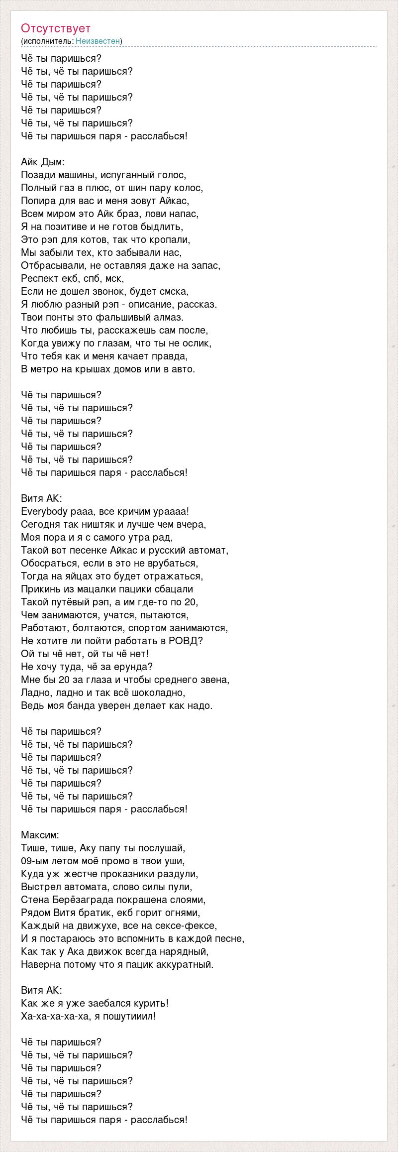 Чё ты паришься? Чё ты, чё ты паришься? Чё ты паришься? Чё ты, чё ты паришься? Чё ты паришься? Чё ты, чё ты паришься? Чё ты паришься паря - расслабься! Айк Дым: Позади машины, испуганный голос, Полный газ в плюс, от шин пару колос, Попира для вас и меня зовут Айкас, Всем миром это Айк браз, лови напас, Я на позитиве и не готов быдлить, Это рэп для котов, так что кропали, Мы забыли тех, кто забывали нас, Отбрасывали, не оставляя даже на запас, Респект екб, спб, мск, Если не дошел звонок, будет смска, Я люблю разный рэп - описание, рассказ. Твои понты это фальшивый алмаз. Что любишь ты, расскажешь сам после, Когда увижу по глазам, что ты не ослик, Что тебя как и меня качает правда, В метро на крышах домов или в авто. Чё ты паришься? Чё ты, чё ты паришься? Чё ты паришься? Чё ты, чё ты паришься? Чё ты паришься? Чё ты, чё ты паришься? Чё ты паришься паря - расслабься! Витя АК: Everybody рааа, все кричим ураааа! Сегодня так ништяк и лучше чем вчера, Моя пора и я с самого утра рад, Такой вот песенке Айкас и русский автомат, Обосраться, если в это не врубаться, Тогда на яйцах это будет отражаться, Прикинь из мацалки пацики сбацали Такой путёвый рэп, а им где-то по 20, Чем занимаются, учатся, пытаются, Работают, болтаются, спортом занимаются, Не хотите ли пойти работать в РОВД? Ой ты чё нет, ой ты чё нет! Не хочу туда, чё за ерунда? Мне бы 20 за глаза и чтобы среднего звена, Ладно, ладно и так всё шоколадно, Ведь моя банда уверен делает как надо. Чё ты паришься? Чё ты, чё ты паришься? Чё ты паришься? Чё ты, чё ты паришься? Чё ты паришься? Чё ты, чё ты паришься? Чё ты паришься паря - расслабься! Максим: Тише, тише, Аку папу ты послушай, 09-ым летом моё промо в твои уши, Куда уж жестче проказники раздули, Выстрел автомата, слово силы пули, Стена Берёзаграда покрашена слоями, Рядом Витя братик, екб горит огнями, Каждый на движухе, все на сексе-фексе, И я постараюсь это вспомнить в каждой песне, Как так у Ака движок всегда нарядный, Наверна потому что я пацик аккуратный. Витя АК: Как же я уже заебался курить! Ха-ха-ха-ха-ха, я пошутииил! Чё ты паришься? Чё ты, чё ты паришься? Чё ты паришься? Чё ты, чё ты паришься? Чё ты паришься? Чё ты, чё ты паришься? Чё ты паришься паря - расслабься!