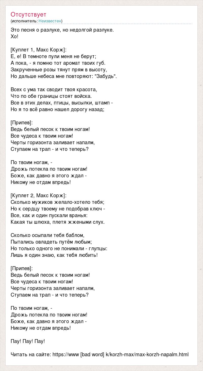 Это песня о разлуке, но недолгой разлуке. Хо! [Куплет 1, Макс Корж]: Е, е! В темноте пули меня не берут; А пока, - я помню тот аромат твоих губ. Закрученные розы тянут прям в высоту, Но дальше небеса мне повторяют: "Забудь". Всех с ума так сводит твоя красота, Что по обе границы стоят войска. Все в этих делах, птицы, высылки, штамп - Но я то всё равно нашел дорогу назад; [Припев]: Ведь белый песок к твоим ногам! Все чудеса к твоим ногам! Черты горизонта заливает напалм, Ступаем на трап - и что теперь? По твоим ногам, - Дрожь потекла по твоим ногам! Боже, как давно я этого ждал - Никому не отдам впредь! [Куплет 2, Макс Корж]: Сколько мужиков желало-хотело тебя; Но к сердцу твоему не подобрав ключ - Все, как и один пускали вранья: Какая ты шлюха, плетя жжеными слух. Сколько осыпали тебя баблом, Пытались овладеть путём любым; Но только одного не понимали - глупцы: Лишь я один знаю, как тебя любить! [Припев]: Ведь белый песок к твоим ногам! Все чудеса к твоим ногам! Черты горизонта заливает напалм, Ступаем на трап - и что теперь? По твоим ногам, - Дрожь потекла по твоим ногам! Боже, как давно я этого ждал - Никому не отдам впредь! Пау! Пау! Пау! Читать на сайте: https://www [bad word] k/korzh-max/max-korzh-napalm.html