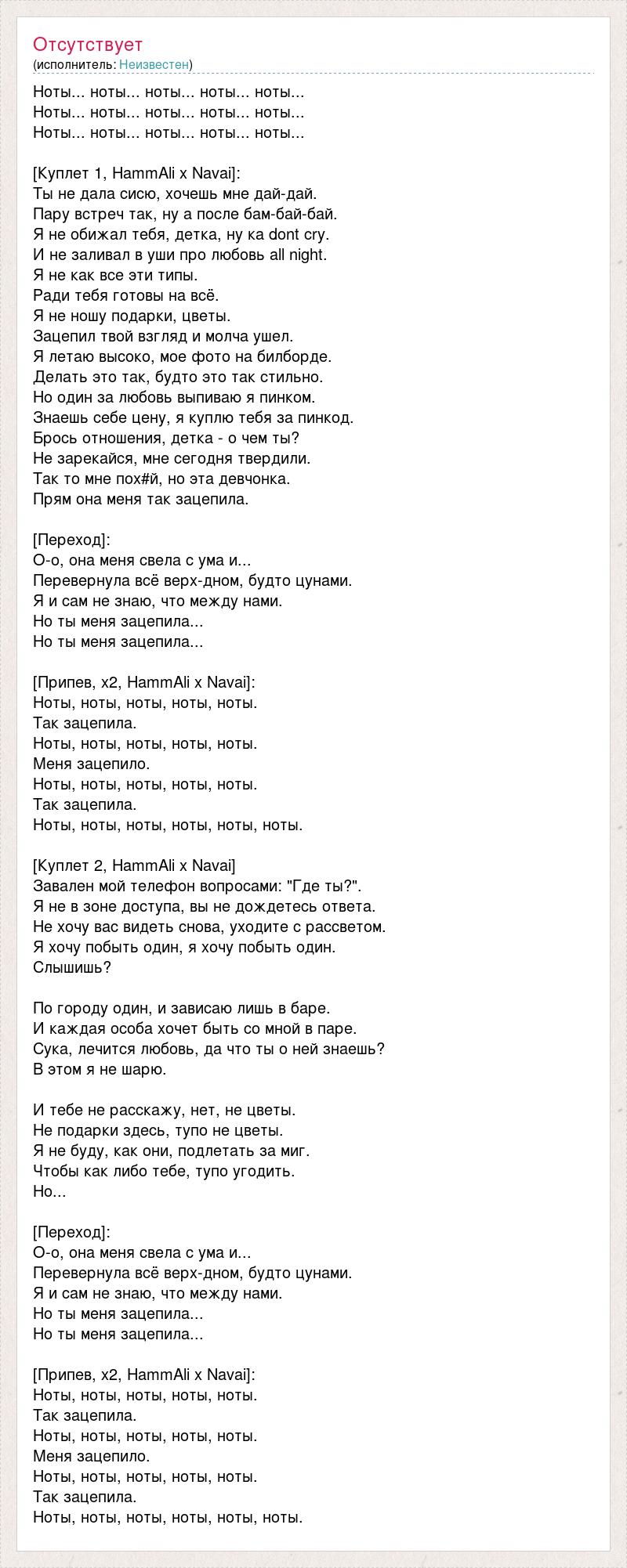 Ноты... ноты... ноты... ноты... ноты... Ноты... ноты... ноты... ноты... ноты... Ноты... ноты... ноты... ноты... ноты... [Куплет 1, HammAli x Navai]: Ты не дала сисю, хочешь мне дай-дай. Пару встреч так, ну а после бам-бай-бай. Я не обижал тебя, детка, ну ка dont cry. И не заливал в уши про любовь all night. Я не как все эти типы. Ради тебя готовы на всё. Я не ношу подарки, цветы. Зацепил твой взгляд и молча ушел. Я летаю высоко, мое фото на билборде. Делать это так, будто это так стильно. Но один за любовь выпиваю я пинком. Знаешь себе цену, я куплю тебя за пинкод. Брось отношения, детка - о чем ты? Не зарекайся, мне сегодня твердили. Так то мне пох#й, но эта девчонка. Прям она меня так зацепила. [Переход]: О-о, она меня свела с ума и... Перевернула всё верх-дном, будто цунами. Я и сам не знаю, что между нами. Но ты меня зацепила... Но ты меня зацепила... [Припев, х2, HammAli x Navai]: Ноты, ноты, ноты, ноты, ноты. Так зацепила. Ноты, ноты, ноты, ноты, ноты. Меня зацепило. Ноты, ноты, ноты, ноты, ноты. Так зацепила. Ноты, ноты, ноты, ноты, ноты, ноты. [Куплет 2, HammAli x Navai] Завален мой телефон вопросами: "Где ты?". Я не в зоне доступа, вы не дождетесь ответа. Не хочу вас видеть снова, уходите с рассветом. Я хочу побыть один, я хочу побыть один. Слышишь? По городу один, и зависаю лишь в баре. И каждая особа хочет быть со мной в паре. Сука, лечится любовь, да что ты о ней знаешь? В этом я не шарю. И тебе не расскажу, нет, не цветы. Не подарки здесь, тупо не цветы. Я не буду, как они, подлетать за миг. Чтобы как либо тебе, тупо угодить. Но... [Переход]: О-о, она меня свела с ума и... Перевернула всё верх-дном, будто цунами. Я и сам не знаю, что между нами. Но ты меня зацепила... Но ты меня зацепила... [Припев, х2, HammAli x Navai]: Ноты, ноты, ноты, ноты, ноты. Так зацепила. Ноты, ноты, ноты, ноты, ноты. Меня зацепило. Ноты, ноты, ноты, ноты, ноты. Так зацепила. Ноты, ноты, ноты, ноты, ноты, ноты.