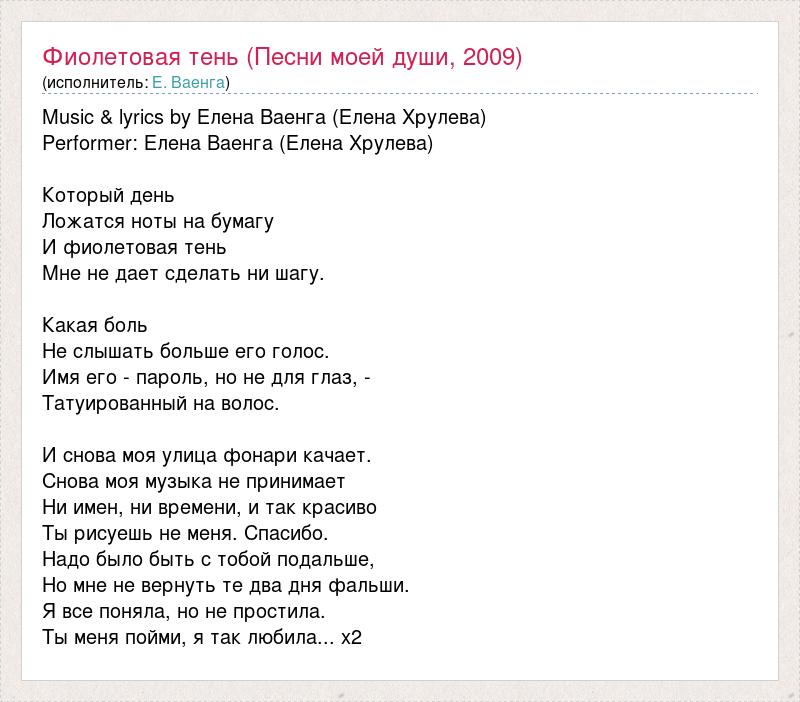 Name: Е. Ваенга - Фиолетовая тень (Песни моей души. Неизданное, 2009) Music & lyrics by Елена Ваенга (Елена Хрулева) Performer: Елена Ваенга (Елена Хрулева) Который день Ложатся ноты на бумагу И фиолетовая тень Мне не дает сделать ни шагу. Какая боль Не слышать больше его голос. Имя его - пароль, но не для глаз, - Татуированный на волос. И снова моя улица фонари качает. Снова моя музыка не принимает Ни имен, ни времени, и так красиво Ты рисуешь не меня. Спасибо. Надо было быть с тобой подальше, Но мне не вернуть те два дня фальши. Я все поняла, но не простила. Ты меня пойми, я так любила... x2