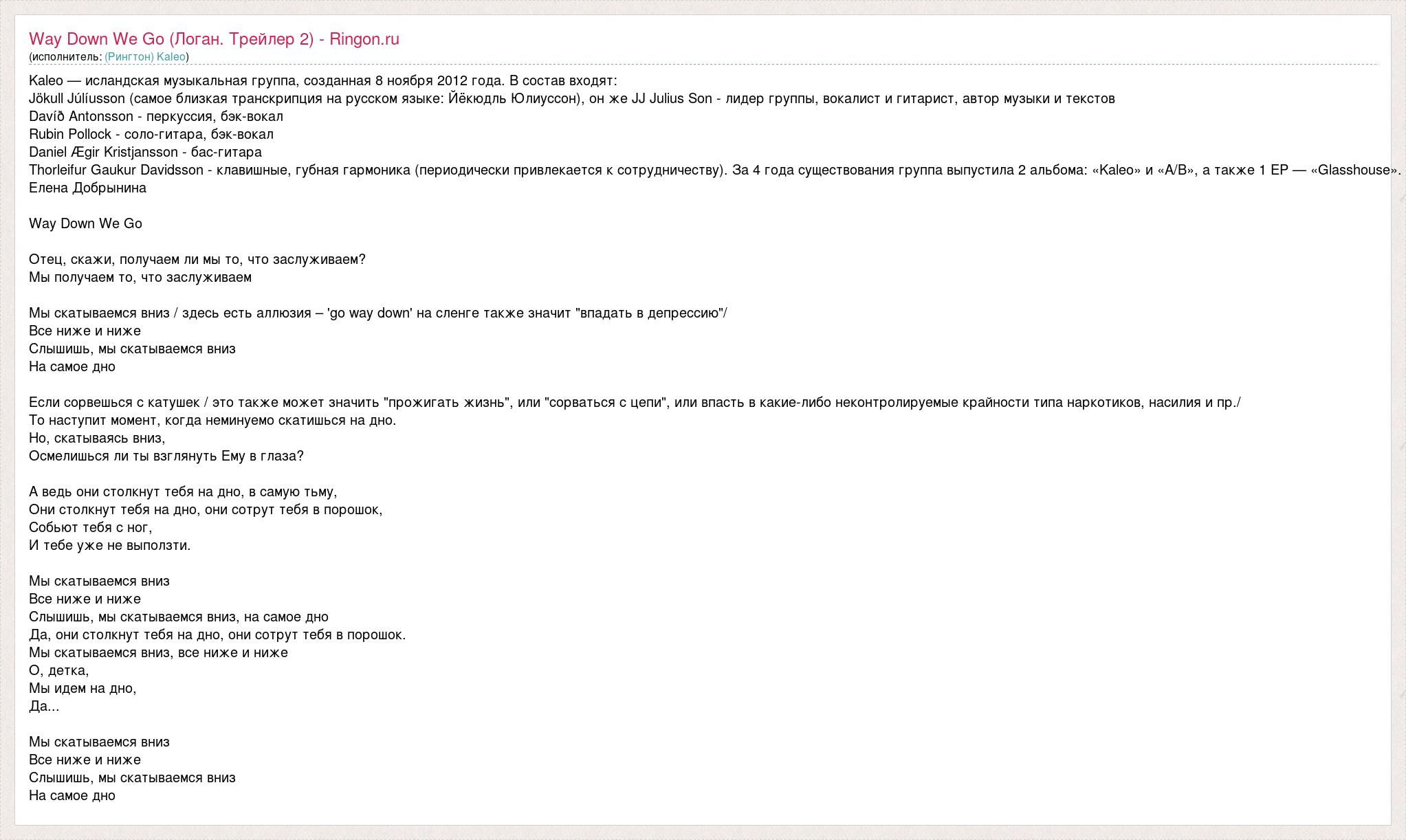 Kaleo — исландская музыкальная группа, созданная 8 ноября 2012 года. В состав входят: Jökull Júlíusson (самое близкая транскрипция на русском языке: Йёкюдль Юлиуссон), он же JJ Julius Son - лидер группы, вокалист и гитарист, автор музыки и текстов Davíð Antonsson - перкуссия, бэк-вокал Rubin Pollock - соло-гитара, бэк-вокал Daniel Ægir Kristjansson - бас-гитара Thorleifur Gaukur Davidsson - клавишные, губная гармоника (периодически привлекается к сотрудничеству). За 4 года существования группа выпустила 2 альбома: «Kaleo» и «A/B», а также 1 EP — «Glasshouse». Елена Добрынина Way Down We Go Отец, скажи, получаем ли мы то, что заслуживаем? Мы получаем то, что заслуживаем Мы скатываемся вниз / здесь есть аллюзия – 'go way down' на сленге также значит "впадать в депрессию"/ Все ниже и ниже Слышишь, мы скатываемся вниз На самое дно Если сорвешься с катушек / это также может значить "прожигать жизнь", или "сорваться с цепи", или впасть в какие-либо неконтролируемые крайности типа наркотиков, насилия и пр./ То наступит момент, когда неминуемо скатишься на дно. Но, скатываясь вниз, Осмелишься ли ты взглянуть Ему в глаза? А ведь они столкнут тебя на дно, в самую тьму, Они столкнут тебя на дно, они сотрут тебя в порошок, Собьют тебя с ног, И тебе уже не выползти. Мы скатываемся вниз Все ниже и ниже Слышишь, мы скатываемся вниз, на самое дно Да, они столкнут тебя на дно, они сотрут тебя в порошок. Мы скатываемся вниз, все ниже и ниже О, детка, Мы идем на дно, Да... Мы скатываемся вниз Все ниже и ниже Слышишь, мы скатываемся вниз На самое дно