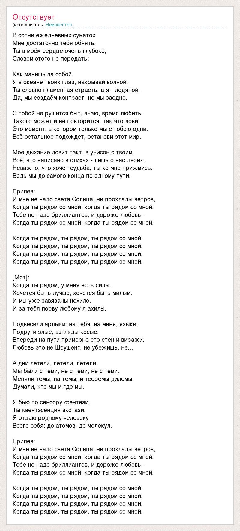В сотни ежедневных суматох Мне достаточно тебя обнять. Ты в моём сердце очень глубоко, Словом этого не передать: Как манишь за собой. Я в океане твоих глаз, накрывай волной. Ты словно пламенная страсть, а я - ледяной. Да, мы создаём контраст, но мы заодно. С тобой не рушится быт, знаю, время любить. Такого может и не повторится, так что лови. Это момент, в котором только мы с тобою одни. Всё остальное подождет, останови этот мир. Моё дыхание ловит такт, в унисон с твоим. Всё, что написано в стихах - лишь о нас двоих. Неважно, что хочет судьба, ты ко мне прижмись. Ведь мы до самого конца по одному пути. Припев: И мне не надо света Солнца, ни прохлады ветров, Когда ты рядом со мной; когда ты рядом со мной. Тебе не надо бриллиантов, и дороже любовь - Когда ты рядом со мной; когда ты рядом со мной. Когда ты рядом, ты рядом, ты рядом со мной. Когда ты рядом, ты рядом, ты рядом со мной. Когда ты рядом, ты рядом, ты рядом со мной. Когда ты рядом, ты рядом, ты рядом со мной. [Мот]: Когда ты рядом, у меня есть силы. Хочется быть лучше, хочется быть милым. И мы уже завязаны нехило. И за тебя порву любому я ахилы. Подвесили ярлыки: на тебя, на меня, языки. Подруги злые, взгляды косые. Впереди на пути примерно сто стен и виражи. Любовь это не Шоушенг, не убежишь, не... А дни летели, летели, летели. Мы были с теми, не с теми, не с теми. Меняли темы, на темы, и теоремы дилемы. Думали, кто мы и где мы. Я бью по сенсору фэнтези. Ты квентэсенция экстази. Я отдаю родному человеку Всего себя: до атомов, до молекул. Припев: И мне не надо света Солнца, ни прохлады ветров, Когда ты рядом со мной; когда ты рядом со мной. Тебе не надо бриллиантов, и дороже любовь - Когда ты рядом со мной; когда ты рядом со мной. Когда ты рядом, ты рядом, ты рядом со мной. Когда ты рядом, ты рядом, ты рядом со мной. Когда ты рядом, ты рядом, ты рядом со мной. Когда ты рядом, ты рядом, ты рядом со мной.
