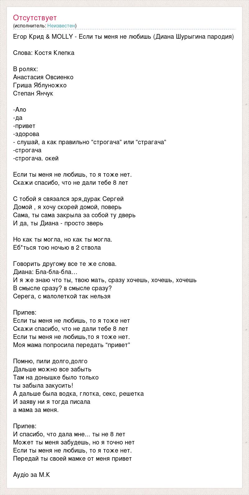 Егор Крид & MOLLY - Если ты меня не любишь (Диана Шурыгина пародия) Слова: Костя Клепка В ролях: Анастасия Овсиенко Гриша Яблуножко Степан Янчук -Ало -да -привет -здорова - слушай, а как правильно “строгача” или “страгача” -строгача -строгача. окей Если ты меня не любишь, то я тоже нет. Скажи спасибо, что не дали тебе 8 лет С тобой я связался зря,дурак Сергей Домой , я хочу скорей домой, поверь Сама, ты сама закрыла за собой ту дверь И да, ты Диана - просто зверь Но как ты могла, но как ты могла. Еб*ться тою ночью в 2 ствола Говорить другому все те же слова. Диана: Бла-бла-бла… И я же знаю что ты, твою мать, сразу хочешь, хочешь, хочешь В смысле сразу? в смысле сразу? Серега, с малолеткой так нельзя Припев: Если ты меня не любишь, то я тоже нет Скажи спасибо, что не дали тебе 8 лет Если ты меня не любишь,то я тоже нет. Моя мама попросила передать “привет” Помню, пили долго,долго Дальше можно все забыть Там на донышке было только ты забыла закусить! А дальше была водка, глотка, секс, решетка И заяву ни я тогда писала а мама за меня. Припев: И спасибо, что дала мне... ты не 8 лет Может ты меня забудешь, но я точно нет Если ты меня не любишь, то я тоже нет. Передай ты своей мамке от меня привет Аудіо за М.К