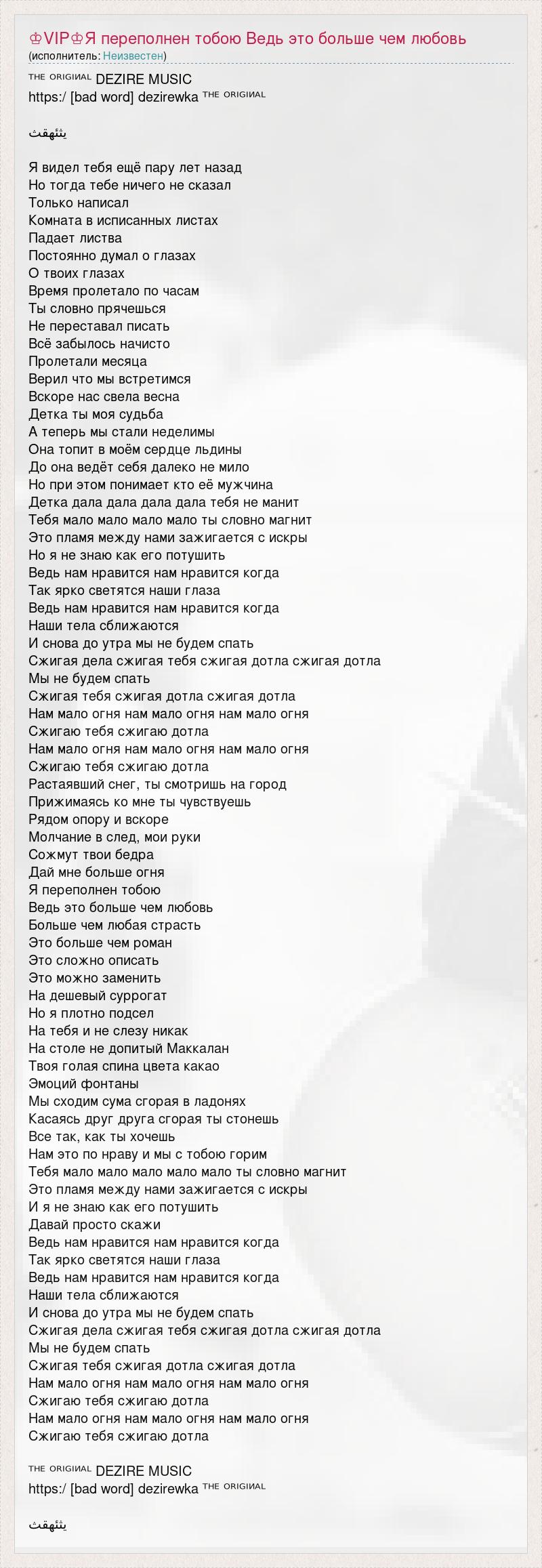 ᵀᴴᴱ ᴼᴿᴵᴳᴵᴻᴬᴸ DEZIRE MUSIC https:/ [bad word] dezirewka ᵀᴴᴱ ᴼᴿᴵᴳᴵᴻᴬᴸ يثئهقث Я видел тебя ещё пару лет назад Но тогда тебе ничего не сказал Только написал Комната в исписанных листах Падает листва Постоянно думал о глазах О твоих глазах Время пролетало по часам Ты словно прячешься Не переставал писать Всё забылось начисто Пролетали месяца Верил что мы встретимся Вскоре нас свела весна Детка ты моя судьба А теперь мы стали неделимы Она топит в моём сердце льдины До она ведёт себя далеко не мило Но при этом понимает кто её мужчина Детка дала дала дала дала тебя не манит Тебя мало мало мало мало ты словно магнит Это пламя между нами зажигается с искры Но я не знаю как его потушить Ведь нам нравится нам нравится когда Так ярко светятся наши глаза Ведь нам нравится нам нравится когда Наши тела сближаются И снова до утра мы не будем спать Сжигая дела сжигая тебя сжигая дотла сжигая дотла Мы не будем спать Сжигая тебя сжигая дотла сжигая дотла Нам мало огня нам мало огня нам мало огня Сжигаю тебя сжигаю дотла Нам мало огня нам мало огня нам мало огня Сжигаю тебя сжигаю дотла Растаявший снег, ты смотришь на город Прижимаясь ко мне ты чувствуешь Рядом опору и вскоре Молчание в след, мои руки Сожмут твои бедра Дай мне больше огня Я переполнен тобою Ведь это больше чем любовь Больше чем любая страсть Это больше чем роман Это сложно описать Это можно заменить На дешевый суррогат Но я плотно подсел На тебя и не слезу никак На столе не допитый Маккалан Твоя голая спина цвета какао Эмоций фонтаны Мы сходим сума сгорая в ладонях Касаясь друг друга сгорая ты стонешь Все так, как ты хочешь Нам это по нраву и мы с тобою горим Тебя мало мало мало мало мало ты словно магнит Это пламя между нами зажигается с искры И я не знаю как его потушить Давай просто скажи Ведь нам нравится нам нравится когда Так ярко светятся наши глаза Ведь нам нравится нам нравится когда Наши тела сближаются И снова до утра мы не будем спать Сжигая дела сжигая тебя сжигая дотла сжигая дотла Мы не будем спать Сжигая тебя сжигая дотла сжигая дотла Нам мало огня нам мало огня нам мало огня Сжигаю тебя сжигаю дотла Нам мало огня нам мало огня нам мало огня Сжигаю тебя сжигаю дотла ᵀᴴᴱ ᴼᴿᴵᴳᴵᴻᴬᴸ DEZIRE MUSIC https:/ [bad word] dezirewka ᵀᴴᴱ ᴼᴿᴵᴳᴵᴻᴬᴸ يثئهقث