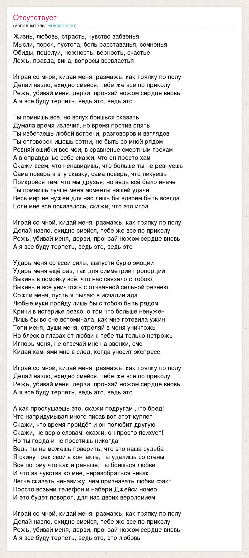 Жизнь, любовь, страсть, чувство забвенья Мысли, порок, пустота, боль расставанья, сомненья Обиды, поцелуи, нежность, верность, счастье Ложь, правда, вина, вопросы всевластья Играй со мной, кидай меня, размажь, как тряпку по полу Делай назло, ехидно смейся, тебе же все по приколу Режь, убивай меня, дерзи, пронзай ножом сердце вновь А я все буду терпеть, ведь это, ведь это Ты помнишь все, но вслух боишься сказать Думала время излечит, но время против опять Ты избегаешь любой встречи, разговоров и взглядов Ты отговорок ищешь сотни, не быть со мной рядом Ровняй ошибки все мои, в сравненье смертным грехам А в оправданье себе скажи, что он просто хам Скажи всем, что ненавидишь, что больше ты не ревнуешь Сама поверь в эту сказку, сама поверь, что ликуешь Прикройся тем, что мы друзья, но ведь всё было иначе Ты помнишь лучше меня моменты нашей удачи Весь мир не нужен для нас лишь бы вдвоём быть всегда Если мне всё показалось, скажи, что это игра Играй со мной, кидай меня, размажь, как тряпку по полу Делай назло, ехидно смейся, тебе же все по приколу Режь, убивай меня, дерзи, пронзай ножом сердце вновь А я все буду терпеть, ведь это, ведь это Ударь меня со всей силы, выпусти бурю эмоций Ударь меня ещё раз, так для симметрий пропорций Выкинь в помойку всё, что нас связало с тобою Выкинь и всё уничтожь с отчаянной сильной резнею Сожги меня, пусть я пылаю в исчадии ада Любые муки пройду лишь бы с тобою быть рядом Кричи в истерике резко, о том что больше ненужен Лишь бы во сне вспоминала, как мне готовила ужин Топи меня, души меня, стреляй в меня уничтожь Но блеск в глазах от любви к тебе ты только нетрожь Игнорь меня, не отвечай мне на звонки, смс Кидай камнями мне в след, когда уносит экспресс Играй со мной, кидай меня, размажь, как тряпку по полу Делай назло, ехидно смейся, тебе же все по приколу Режь, убивай меня, дерзи, пронзай ножом сердце вновь А я все буду терпеть, ведь это, ведь это А как прослушаешь это, скажи подругам ,что бред! Что напридумывал много писав вот этот куплет Скажи, что время пройдёт и он полюбит другую Скажи, не верю словам, скажи, он просто психует! Но ты горда и не простишь никогда Ведь ты не можешь поверить, что это наша судьба Я скину трек свой в контакте, ты удалишь со стены Все потому что как и раньше, ты боишься любви И что за чувства ко мне, неразобраться никак Легче сказать ненавижу, чем признавать любви факт Просто возьми телефон и набери Джейси номер И это будет поворот, для нас двоих вероломием Играй со мной, кидай меня, размажь, как тряпку по полу Делай назло, ехидно смейся, тебе же все по приколу Режь, убивай меня, дерзи, пронзай ножом сердце вновь А я все буду терпеть, ведь это, это любовь
